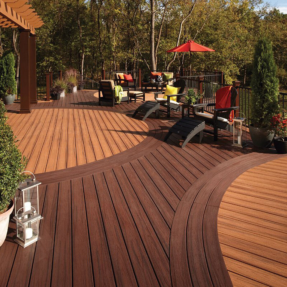 Für Trex-Verbundstoffdielen spricht aus Sicht vieler Händler, Verarbeiter und Verbraucher außerdem, dass nicht nur normale gerade, sondern auch individuell gebogene Bretter erhältlich sind. Die gebogenen Varianten bestehen aus normalen Trex »Transcend«-Dielen, die bei der Ultsch GmbH auf Basis einer Schablone erwärmt und in die gewünschte Form gebracht werden. Mit solchen bogenförmigen Brettern, für die die gleichen Garantiebedingungen gelten wie für die Standard-Ware, ergeben sich neue Möglichkeiten bei der Außerraumgestaltung.