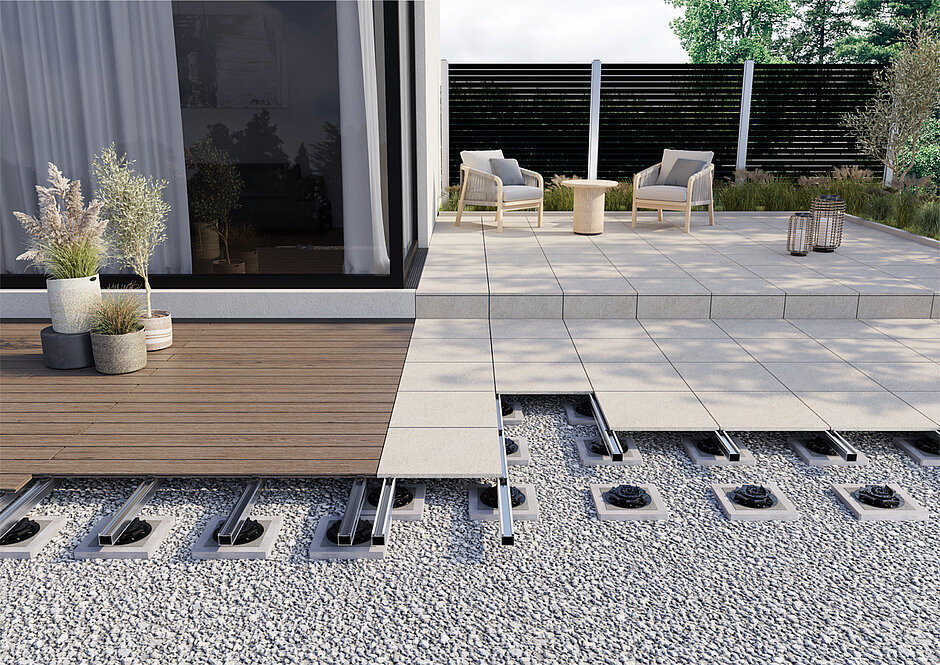 Die flexibel einsetzbare Terrassen-Unterkonstruktion »Trias Alu« ist für ebene Terrassen, Multi-Level-Gestaltungen oder Dachterrassen geeignet. Das System kann dank »Trias-Multiclips« sowohl Dielen- als auch Plattenbeläge aufnehmen. Für dunkle Böden bietet Trias die »Black Line«. Sie sorgt für ein ebenmäßiges Gesamtbild ohne Blitzer. Aluminiumprofile von Trias sind in den Varianten »Slim«, »Basic« und »Ultra« erhältlich. Mit dem Schwerlastprofil »Trias Ultra« können Spannweiten bis zu 3 m überbrückt werden.