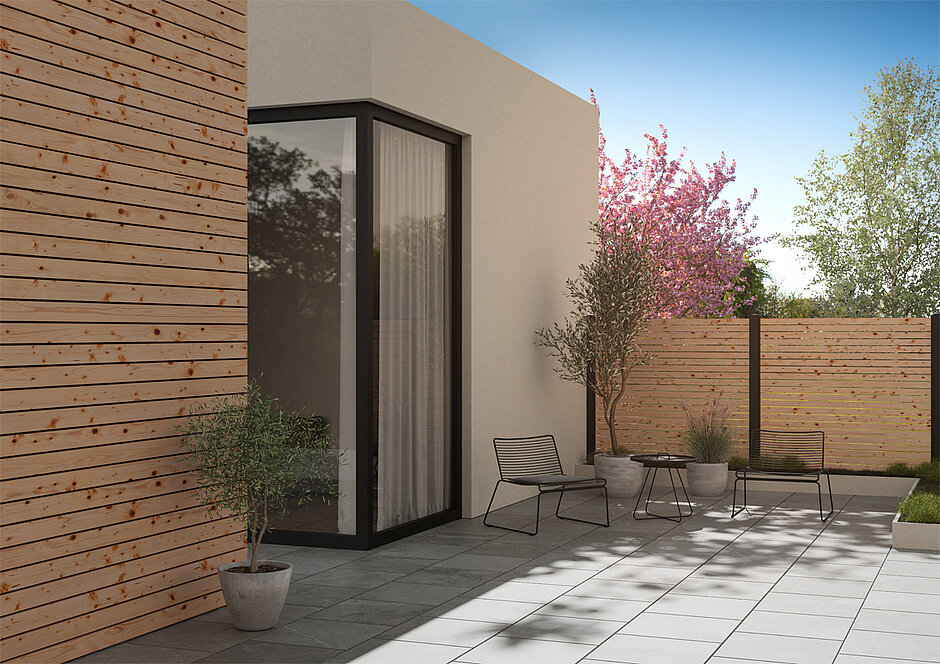 Mit dem modularen Sichtschutz-System von »Trias« können unterschiedlichste Füllungen von der Gabione bis zum Rhombus-Profil kombiniert werden. Besonders attraktiv sind Rhombuselemente in Holzoptik aus pflegeleichten Aluminium. Kernstück des Systems ist der »Trias«-Basispfosten aus witterungsbeständigem Aluminium. Er wird je nach Füllmaterial um entsprechende Anbaumodule ergänzt und ist in drei Farben erhältlich: Aluminium, »Black Line« und Anthrazit. Letztere entspricht RAL 7016 und passt somit hervorragend zu aktuellen Trendoberfläche für Fensterrahmen. Die Form des Pfostens ist schlicht und minimalistisch klar gehalten. Auf drei Seiten befindet sich eine dezente, schmale Nut. Der Pfosten ist auch als Eckpfosten einsetzbar. Je nach Untergrund wird um passende Pfostenträger ergänzt. Für die konkrete Planung des Bedarfs stehen ein Online-Konfigurator für Sichtschutz und ein weiterer für Terrassen zur Verfügung.