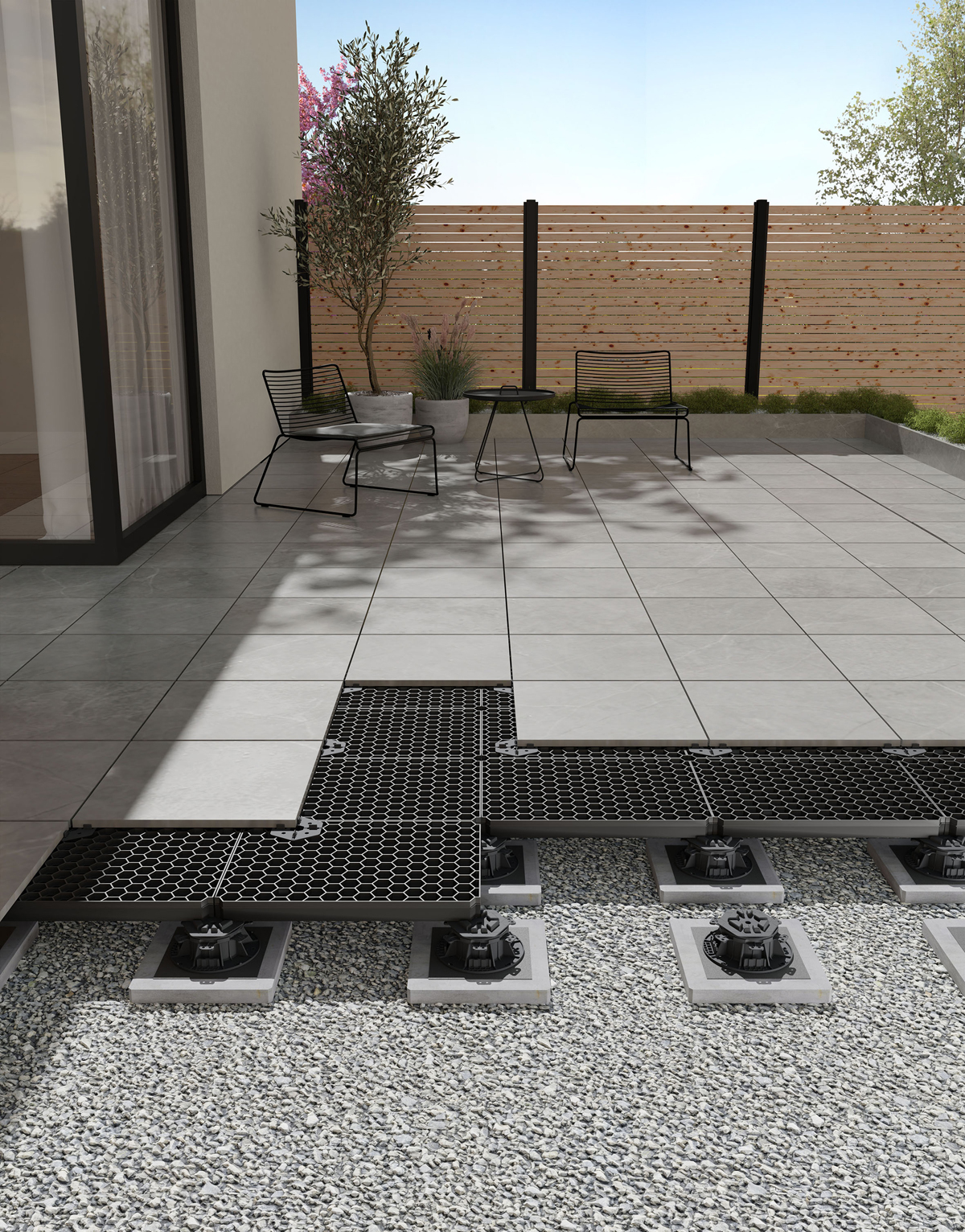 Die flexible einsetzbare Terrassen-Unterkonstruktion »Trias Alu« ist für ebene Terrassen, Multi-Level-Gestaltungen oder Dachterrassen geeignet. Das System kann, dank »Trias-Multiclips«, sowohl Dielen- als auch Plattenbeläge aufnehmen. Für dunkle Böden bietet Trias die »Black Line«. Sie sorgt für ein ebenmäßiges Gesamtbild ohne Blitzer.