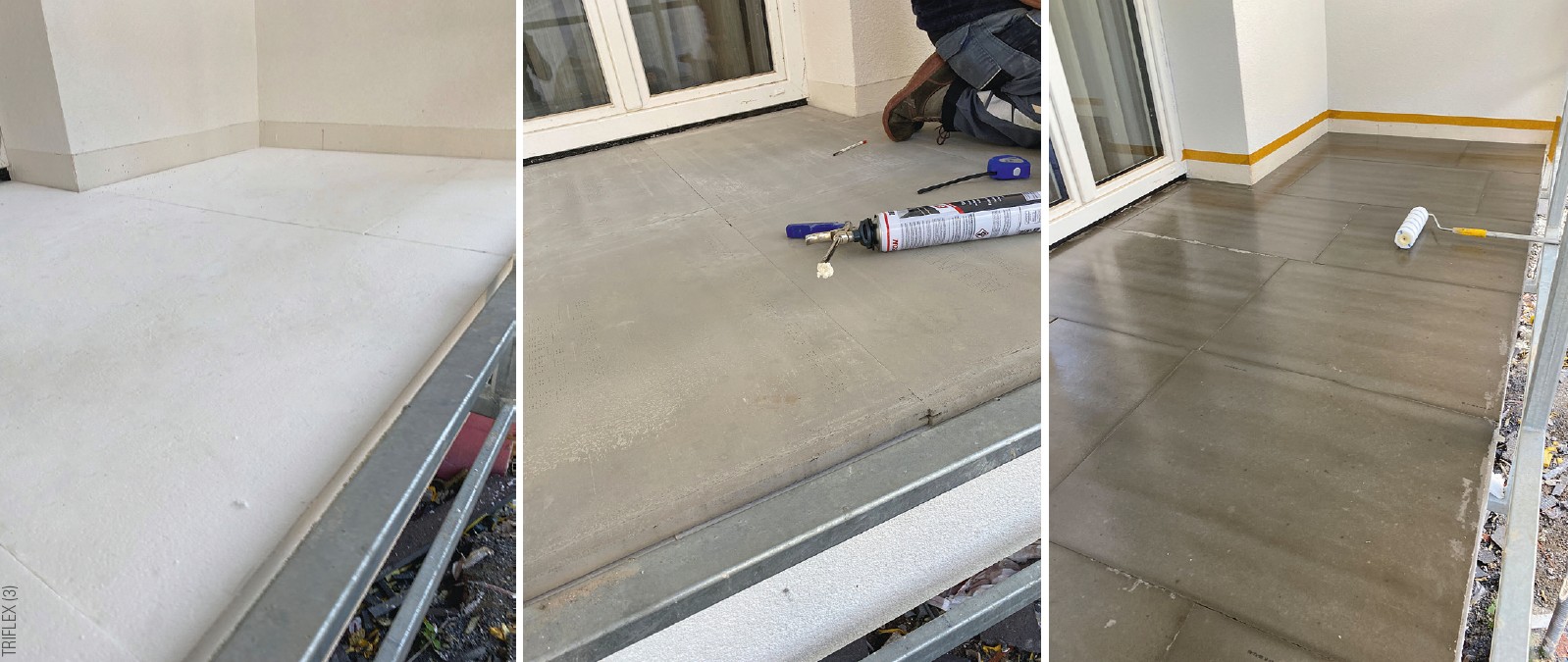 Judith Eder war auf einem Architekten-Symposium von Triflex auf das Sortiment des Flüssigkunststoff-Experten aufmerksam geworden. Dazu gehört auch »Triflex BIS«, ein speziell für Balkone entwickeltes Wärmedämmsystem, das zusammen mit dem Balkon-Abdichtungssystem »Triflex BTS-P« eingesetzt wird. Dabei werden zur Wärmedämmung expandierte Polystyrolhartschaumplatten (EPS) verwendet, auf die anschließend die Flüssigabdichtung auf PMMA-Basis inklusive Nutzschicht aufgetragen wird. Die Kombination aus beidem hat eine Aufbauhöhe von circa 10 cm, was sich bei Sanierungsprojekten wie dem in Mistelbach als vorteilhaft erweist. Darüber hinaus bietet das systemintegrierte »Triflex ProDetail« eine Lösung für Wand- und Türanschlüsse.
