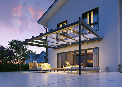 Der Freiraum für persönliche Gestaltung ist ein wichtiger Bestandteil der Terrassendächer von TS-Aluminium. Daher sind auch reichlich Extras verfügbar, u.a. LED-Beleuchtung und Heizsysteme. Die Glasfläche lässt sich mit Unter- oder Überglasmarkisen verschatten. Der Farbgestaltung des Lamellendaches sind dank der werkseitigen Pulverbeschichtung keine Grenzen gesetzt – und die Profile kommen gleich im Wunschfarbton auf die Baustelle. Das geradlinige Dach fügt sich so harmonisch in die Architektur von Haus und Garten ein. Die Maße reichen bis 8 m Breite und 4,50 m Tiefe.