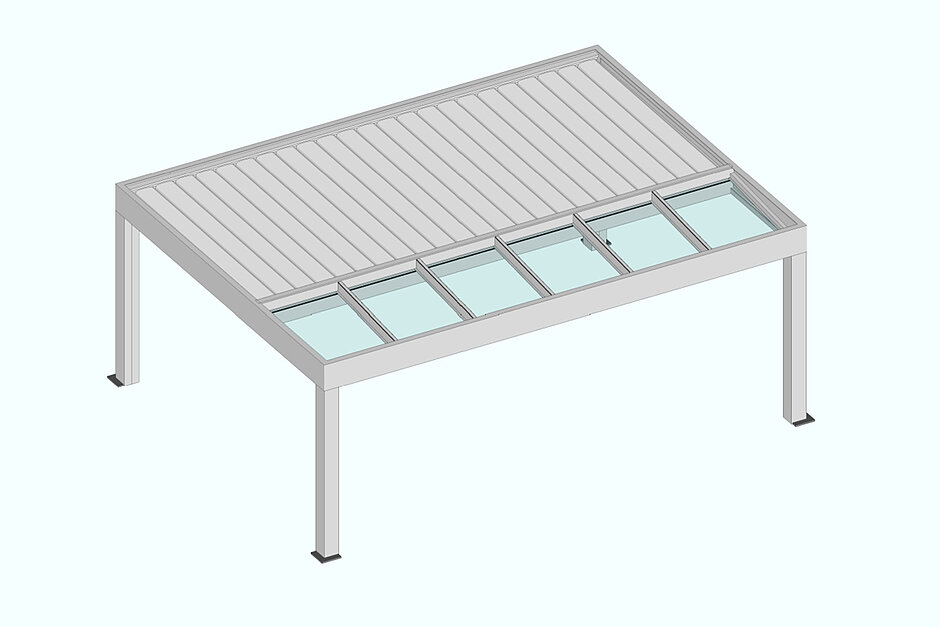 TS-Aluminium reagiert mit der neuen Variante auf die gestiegene Nachfrage an Lamellendächern und dem Wunsch von Bauherren nach hellen Wohnräumen. Dabei bleiben die Vorteile einer Lamellen-Überdachung erhalten: Bis 135 ° drehbare Lamellen regulieren Licht, Schatten und natürliche Belüftung unter dem Dach. Die hochwertige Wetterautomatik (»Regenwächter«) sorgt bei Niederschlag dafür, dass sich das Dach von alleine schließt. Geschlossen trägt das Dach bis zu 350 kg Schnee pro Quadratmeter.