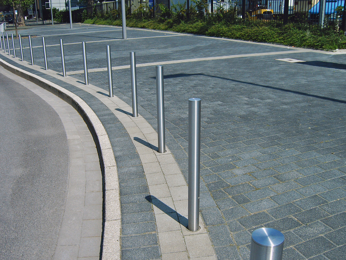 In Düsseldorf entschied man sich für die Edelstahlsperrpfosten des Arnsberger Unternehmens Urbanus, die mit einem Anker am Fuß fest in den Boden betoniert werden, um eine maximale Stabilität zu gewährleisten. Sie trennen deutlich die Fahrbahn vom Gehweg und geben damit ein optisches »Vorsicht-Signal«.