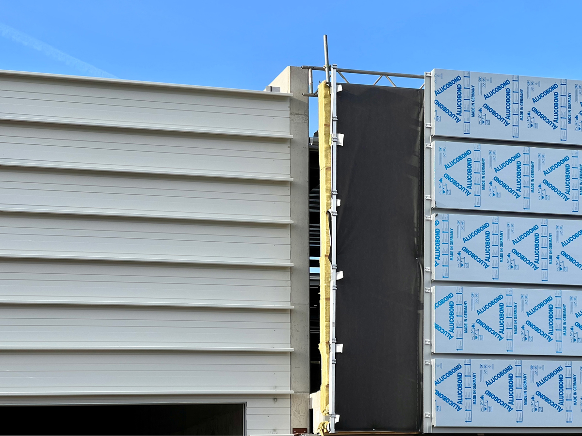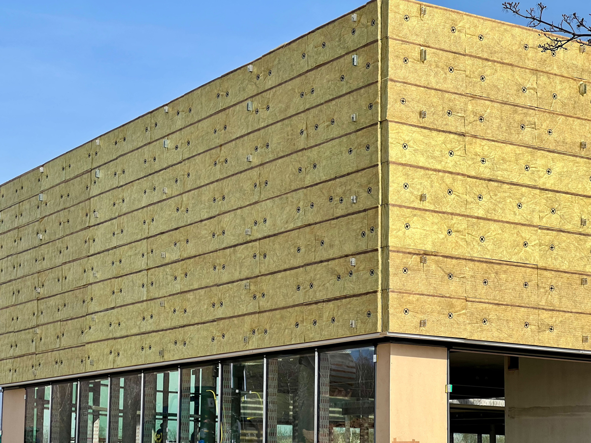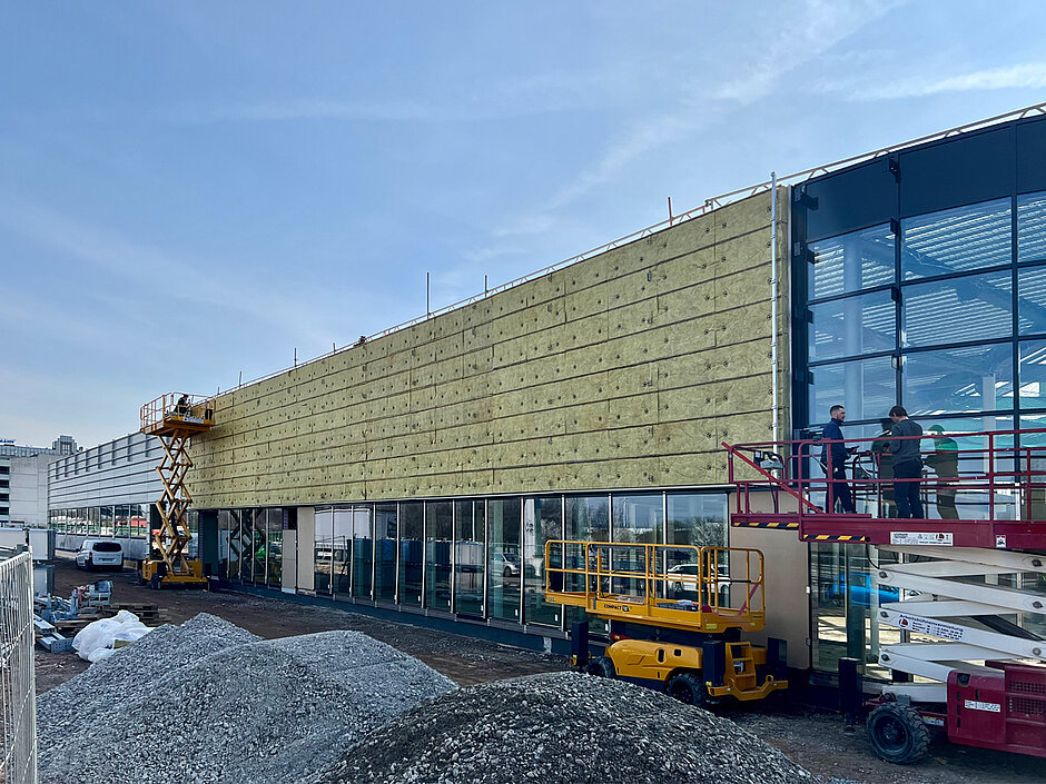 Alle eingesetzten Fassadendämmplatten sowie die Kassettendämmsysteme von Ursa sind nicht brennbar, schall- und wärmedämmend sowie rückbaubar. Durch den sortenreinen Rückbau unterstützen die Systeme die Kreislaufwirtschaft und tragen somit zur Nachhaltigkeit des Bauprojekts bei. Auch lassen sie sich leicht und zeitsparend montieren. Die Fassadenkassettendämmplatten »Ursa Terra FKP 35 Plus« optimieren diese Eigenschaften nochmals: Denn sie bieten eine besonders effiziente Überdämmung des Obergurts der Stahlkassette. Dies reduziert Schall- und Wärmebrücken und trägt somit zur Reduktion von Energiekosten und CO2-Emissionen bei. Die Dämmplatten mit einer Länge von 1 350 mm verfügen zudem im Vergleich zu anderen Produkten über ein sehr großes Format, was eine schnelle und sichere Montage ermöglicht.