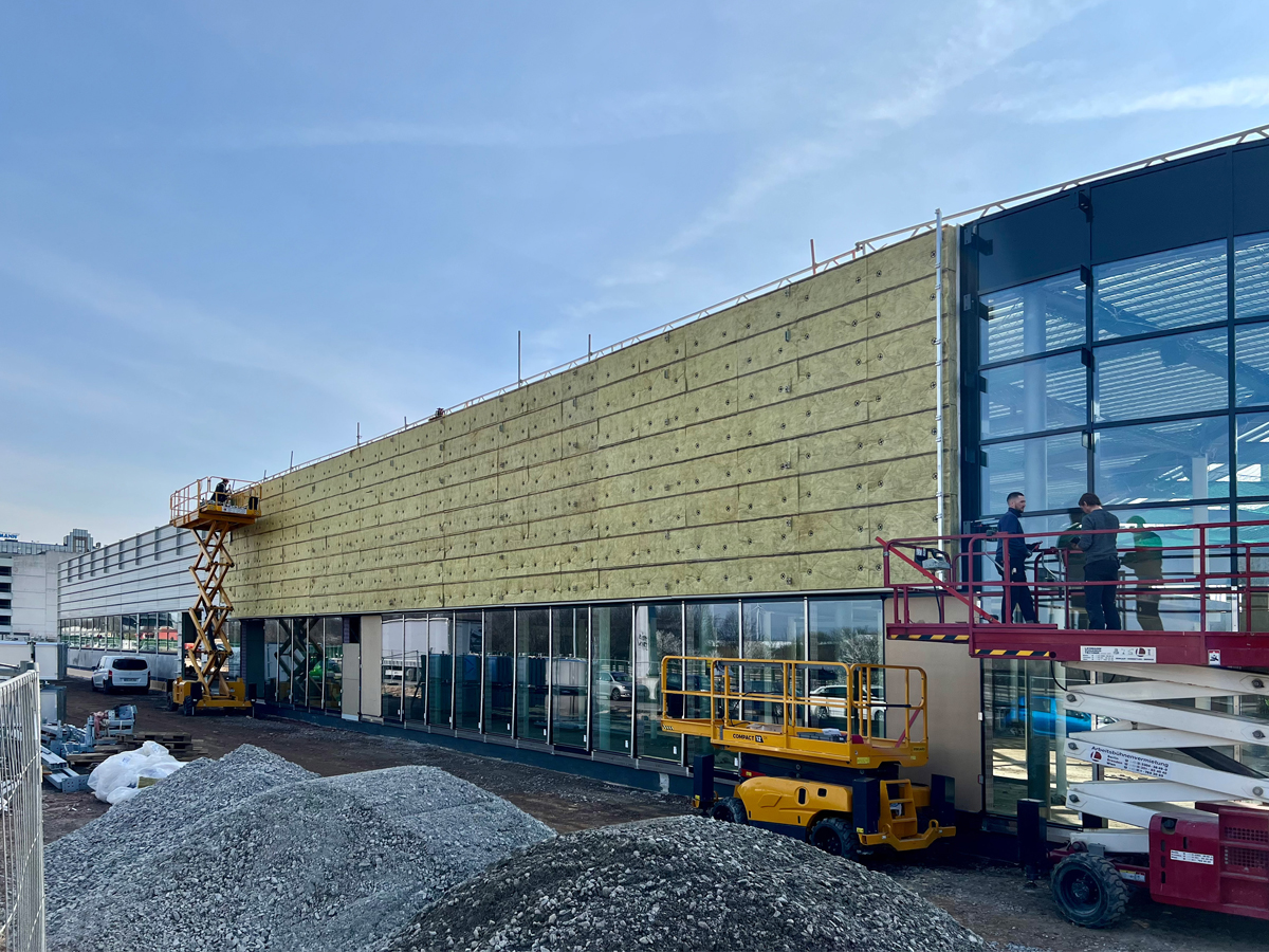 Bei dem Bau des Autozentrums wurde besonderer Wert auf Energieeffizienz und Nachhaltigkeit gelegt. Daher kamen verschiedene Dämmprodukte von Ursa zum Einsatz – auf einer zu dämmenden Gesamtaußenfläche von über 2 000 m². Fassadenkassettendämmplatten vom Typ »Ursa Geo FKP 2«, »Ursa Geo«-Fassadendämmplatten »FDP 2/Vs« und »Ursa Terra«-Fassadenkassettendämmplatten »FKP 35 Plus« mit einer Dicke von 185 mm. Die drei verwendeten Produkte überzeugen vor allem durch ihre wärme- und schalldämmende Wirkung und ihre Nichtbrennbarkeit. Bei »Ursa Terra FKP 35 Plus« sorgt die Überdeckung der Obergurte der Stahlkassetten mit Dämmstoff dafür, dass Wärme- und Schallbrücken noch einmal deutlich reduziert werden.