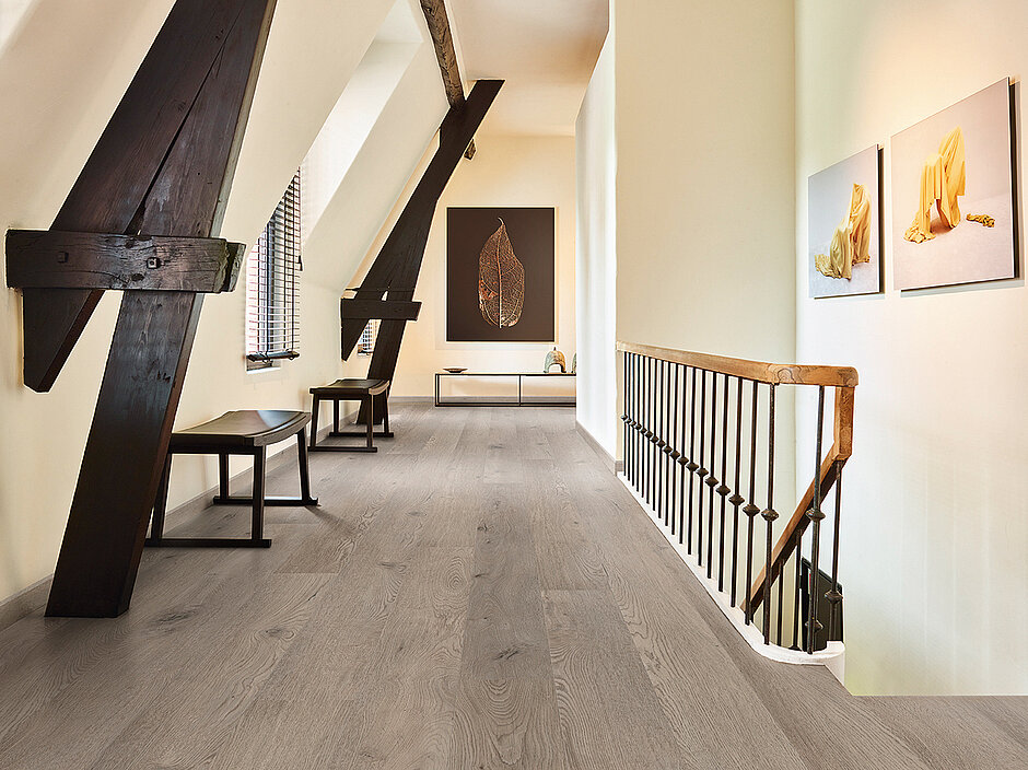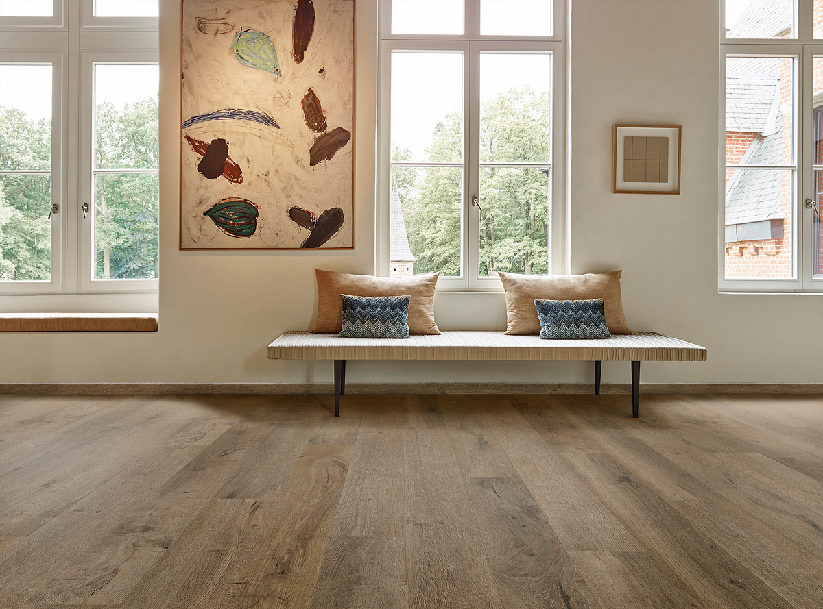 »Die Dielen haben die stattliche Länge von 2,1 m. Das ist außergewöhnlich«, erklärt Thibault Lanchon, Quality Manager bei »Coretec Floors«. »Außerdem sind sie auch noch 1,5 cm dick. Der besonders dicke Kern bietet den langen Dielen eine hervorragende Stabilität.« Auch an der Oberseite ist der Schutz laut Thibault hervorragend: Die Verschleißschicht ist mit 0,8 mm noch 60 Prozent dicker als bei den anderen »Coretec«-Kollektionen. So erhöht sich die Langlebigkeit des Bodens noch einmal. »Wenn man über einen Laminatboden läuft, klingt dieser durch das Klick-Klack-Geräusch schon etwas billig«, meint Lanchon. »Da fällt es bei diesen ›XL-End‹-Dielen sofort auf, wie gut sie den Schall dämpfen.« Möglich wird es durch die patentierte Soundcore-Technologie im Kern des Fußbodens.
