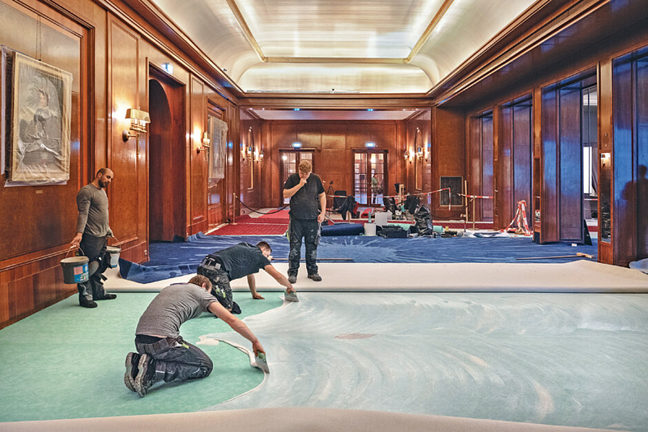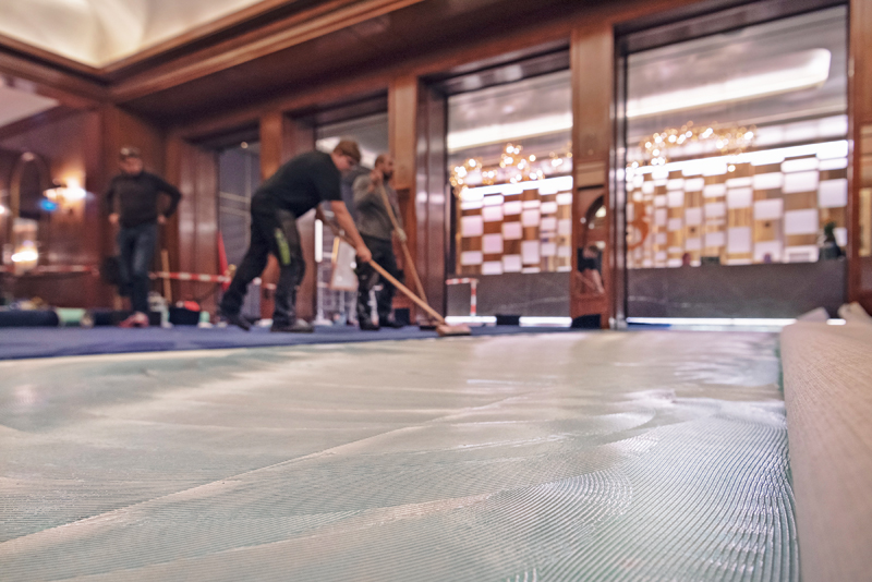 Zur Verbesserung des Gehkomforts im Casinofoyer wurde anschließend eine stabilisierende Dämm- und Wiederaufnahmeunterlage verlegt. »Mit ›UZIN RR 183‹ verbessern wir den Trittschallschutz und sorgen für eine gute Druckverteilung und Maßstabilität«, so Wöhrle. Sie wird normalerweise lose auf den Untergrund ausgelegt und trennt Bodenbeläge bauphysikalisch vom Untergrund. Aufgrund der Größe der Bodenfläche und der zu erwartenden hohen Frequentierung durch die Besucher des Casinos wurde die Unterlage bei diesem Projekt fest verklebt.
