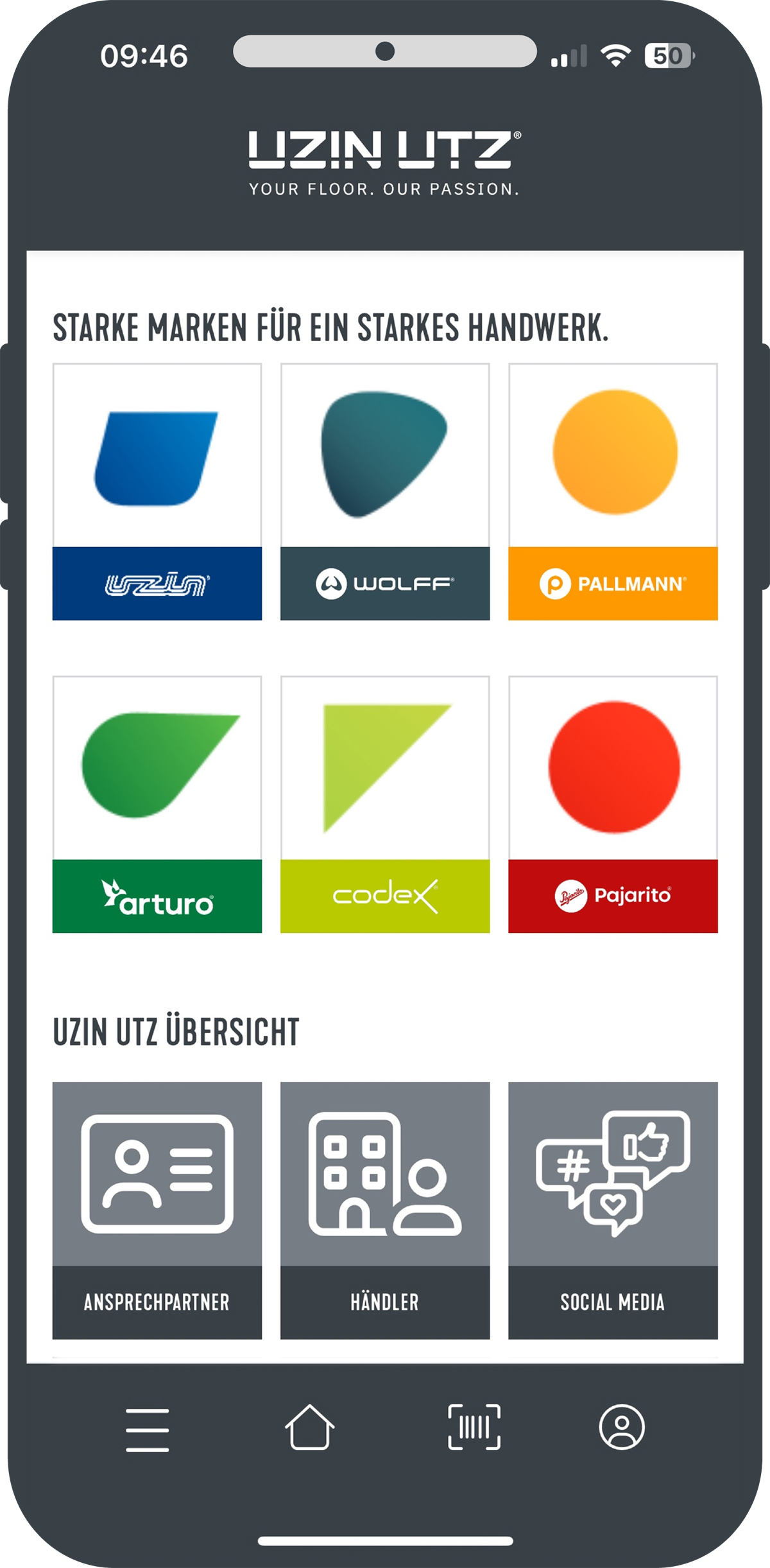 Die »Uzin Utz go App« richtet sich gezielt an das bodenlegende Handwerk und stellt eine zentrale Anlaufstelle für alle digitalen Services der Unternehmensmarken dar. Verschiedene Anwendungen gibt es bereits, doch erstmals vereint eine App die digitalen Tools der Marken Uzin, Wolff, Pallmann, Arturo, Codex und Pajarito auf einer Plattform. Nutzer erhalten schnellen Zugriff auf spezifische Features wie den »Bodennavigator« von Uzin, den »Room Visualiser« von Arturo, den »Codex X-Club« sowie auf lehrreiche Inhalte und aktuelle Neuigkeiten. Die einfache Benutzeroberfläche sorgt dafür, dass alle Funktionen leicht und schnell zugänglich sind.