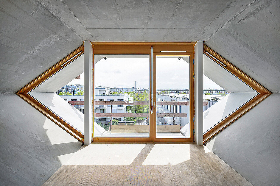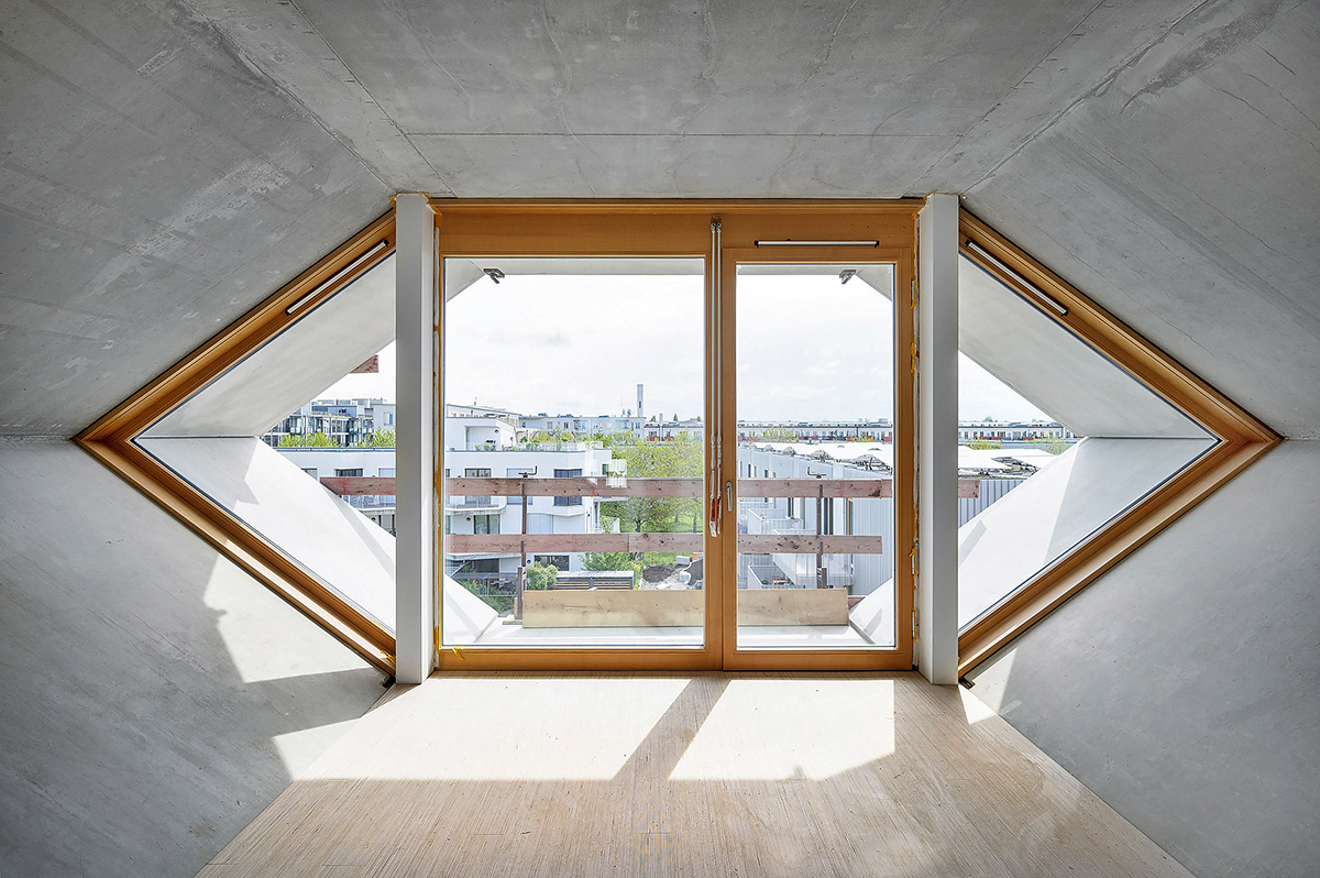 Experimentelle Form mit experimentellem Inhalt – so wünschte es sich der Bauherr. Das Ergebnis ist eine neue Wohnform: gestapelte durchgesteckte Wabenröhren, fast ohne gerade Linien. Architekt Peter Haimerl formuliert es so: »Wir reißen die üblichen Wandstrukturen einer Box für ein neues Raumgefühl auf. Das Rechteck wird zur Wabe, zu einem neuen Lebensraum mit weiterem Horizont.« Hexagonalstrukturen sind in der Natur weit verbreitet. Sie ermöglichen die Kombination zahlreicher Raumeinheiten. »Im Wabenhaus verbinden sich Cluster und vernetzen sich«, so Haimerl. Wände werden zu Verbindungstreppen. Dazu wurde die Seitenfläche des Sechsecks so lange gestaucht, bis sie der DIN-Norm für Treppen entsprach. So gelangen die Bewohner in die nächste Ebene. Klassische Treppenhäuser entfallen. Lediglich eine sogenannte Himmelsleiter verläuft schräg durch das Haus nach oben, verbindet die Etagen und endet in den für alle zugänglichen Aufenthaltsräumen. Das Wabencluster ist laut Architekten besonders gut für genossenschaftliches Leben geeignet: Es ist einbindend und sozial, schafft Gemeinschaft und öffnet sich zur Nachbarschaft.