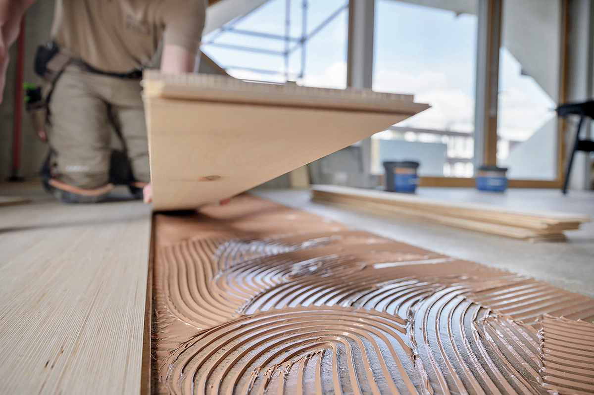 Für ein optimales Raumgefühl sorgen Balkone in jeder Wohnung sowie bodentiefe Fenster. Bei der Parkettverlegung waren jedoch gerade die Wand-, Tür- und Fensteranschlüsse an den Schrägen eine Herausforderung. Der Architekt hatte zudem keine Sockelleisten vorgesehen. Christina Ziegler von ParkettLust zu den Besonderheiten der Bodenverlegung im Wabenhaus: »Es gibt fast keine Geraden, also mussten wir sehr genau arbeiten und viele Anpassungen vornehmen. Vor allem an den Rändern musste alles perfekt stimmen.« Die Schrägen mussten am Boden übernommen werden, daher waren viele Schnitte erforderlich. »Jeder Schnitt musste exakt sitzen, wir hatten da nur drei bis vier Millimeter Luft«, so Christina Ziegler. Auch die Übergänge zum Zementboden und den Fliesen mussten exakt passen, der Estrich war höhenversetzt, damit die Belagsarten zusammenfanden. Dies bedeutete nicht nur handwerkliches Können mit großer Präzision, sondern auch absolut verlässliche Verlegewerkstoffe. Für diesen Einsatz war der harte, schubfeste Klebstoff »Uzin MK 250« die beste Lösung. Die sehr hohe Saughaftung sorgt für den nötigen Halt der Parkettstäbe. Außerdem ist er lösemittelfrei, sehr emissionsarm, ohne weichmachende Inhaltsstoffe, mit dem Umweltlabel »Der Blaue Engel« und einer Umweltproduktdeklaration (EPD) ausgestattet und somit die ideale Wahl für private Wohnräume.