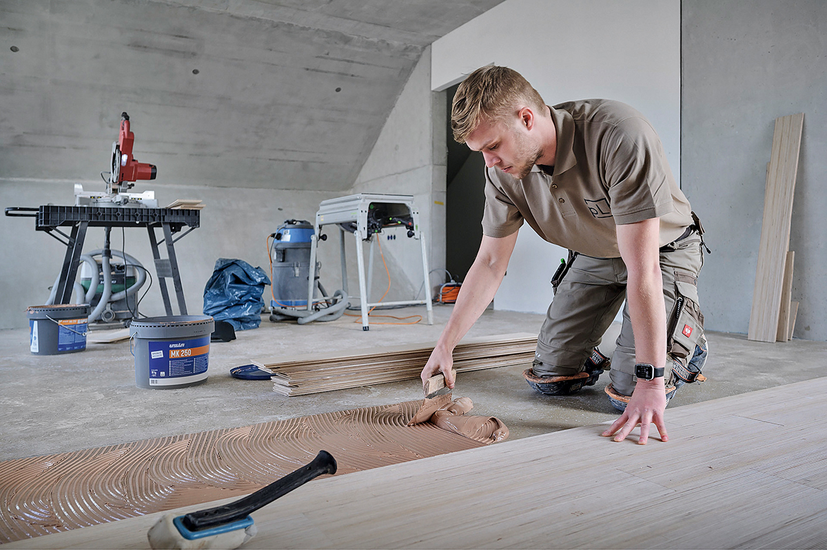 »Vor der Verlegung haben wir die Estrichfeuchte gemessen, danach konnte die einkomponentige PUR-Schnellgrundierung ›Uzin PE 414 BiTurbo‹ aufgetragen werden«, erklärt Heimo Danneberg, Anwendungstechniker bei Uzin. »Sie ist leicht zu verarbeiten, trocknet schnell und erzielt eine griffige Untergrundfläche. Damit optimieren wir den Haftverbund zur nachfolgenden Verklebung des Parketts.« Nun konnte das Team von ParkettLust mit dem eigentlichen Verlegen der Stäbe beginnen. Christina Ziegler ist begeistert: »Der Parkettklebstoff ist absolut verlässlich, ich setze immer auf ihn, wir haben beste Erfahrungen gemacht.« Die Vorteile des »Uzin MK 250«: Er bleibt lange offen, ist dadurch gut verstreichbar, außerdem besitzt er eine starke Anzugskraft und Stehvermögen. Nach zwölf Stunden war der Boden bereits begehbar – wegen des eng mit anderen ausführenden Gewerken abgestimmten Terminplans ein weiterer Vorteil. Im nächsten Arbeitsschritt trug das Team den faserarmierten Parkett-Fugenkitt »Pall X Filler« auf. Nach der kurzen Trocknungszeit erfolgte ein professioneller Schliff und zum Abschluss die Oberflächenvergütung.