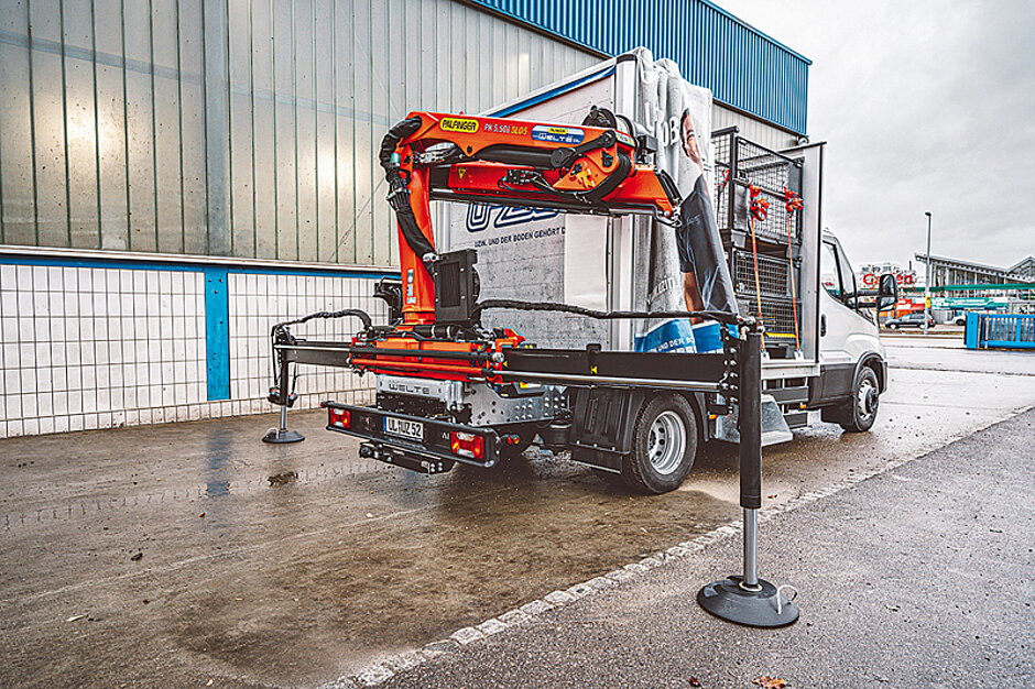Das neue Pump-Mobil ist flexibel, eignet sich für unterschiedliche Materialien und besitzt einen eigenen Fahrzeugkran, mit dem die 1 050 kg schweren Big Packs oder Sackware in den Mischbehälter befördert werden. Dazu ist nur ein geringer Radius nötig. »Aufgrund seiner Größe kann das Pump-Mobil mühelos Baustellen in engen Innenstädten bedienen«, erklärt Thomas Schneider, Leiter der Anwendungstechnik bei Uzin. Die Spachtel- oder Nivelliermasse wird angeliefert und nach Anforderung im Pump-Mobil gemischt – ohne Staubentwicklung, in gleichbleibend guter Konsistenz. Aufgrund des optimalen Mischungsverhältnisses gibt es einheitliche Trocknungszeiten und keine Ansätze.