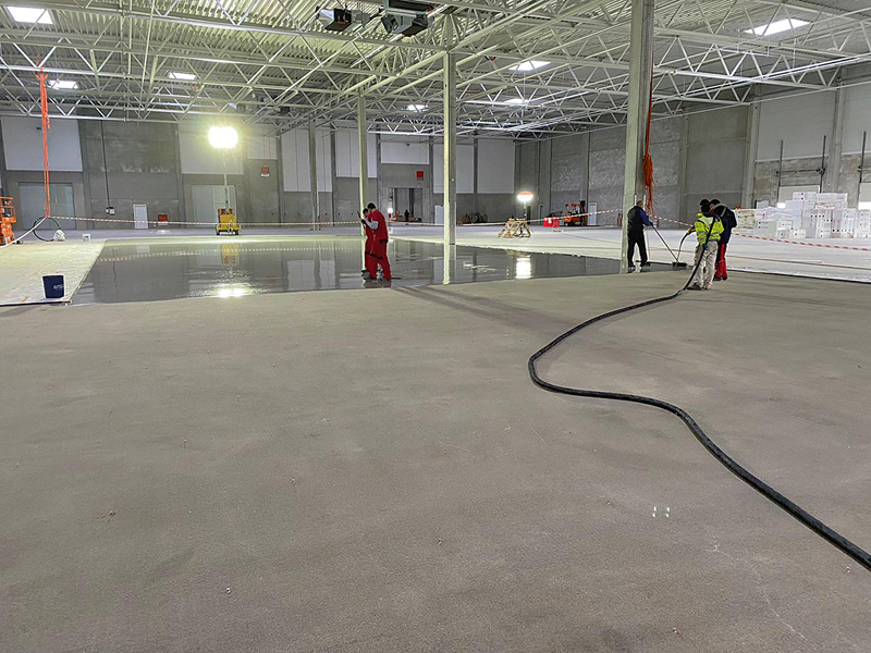 »Das muss auf den Millimeter genau stimmen, sonst wird die Abweichung in der Höhe zu groß«, so Kunzelmann. Zum Ausmessen der Höhenunterschiede wurde ein Spezialunternehmen beauftragt, das mit Lasertechnik ca. alle 100 cm Schraubdübel in den Boden einsetzte, um die korrekten Höhen zu markieren. Zuvor war der Boden zur Untergrundvorbereitung kugelgestrahlt worden – für die nötige Griffigkeit. In einem zweiten Schritt wurde die Epoxidharzgrundierung aufgetragen und sofort mit Quarzsand vollflächig abgestreut. Nach dem Absaugen wurde noch einmal grundiert, dann konnte das Team loslegen. Das Ergebnis: Das Pump-Mobil erfüllt auch bei höheren Schichtstärken seine Aufgabe. Zwischen 9 und 14 Uhr wurden 20 Tonnen mineralische Beschichtung in der optimalen Konsistenz in einem Zug auf die Fläche gebracht. »Um einen planebenen Boden zu erhalten, muss die stets homogen gemischte Masse ohne Unterbrechung gefördert werden, damit keine Ansätze entstehen«, weiß Kunzelmann. »Das ist gut gelungen, genau wie geplant.«