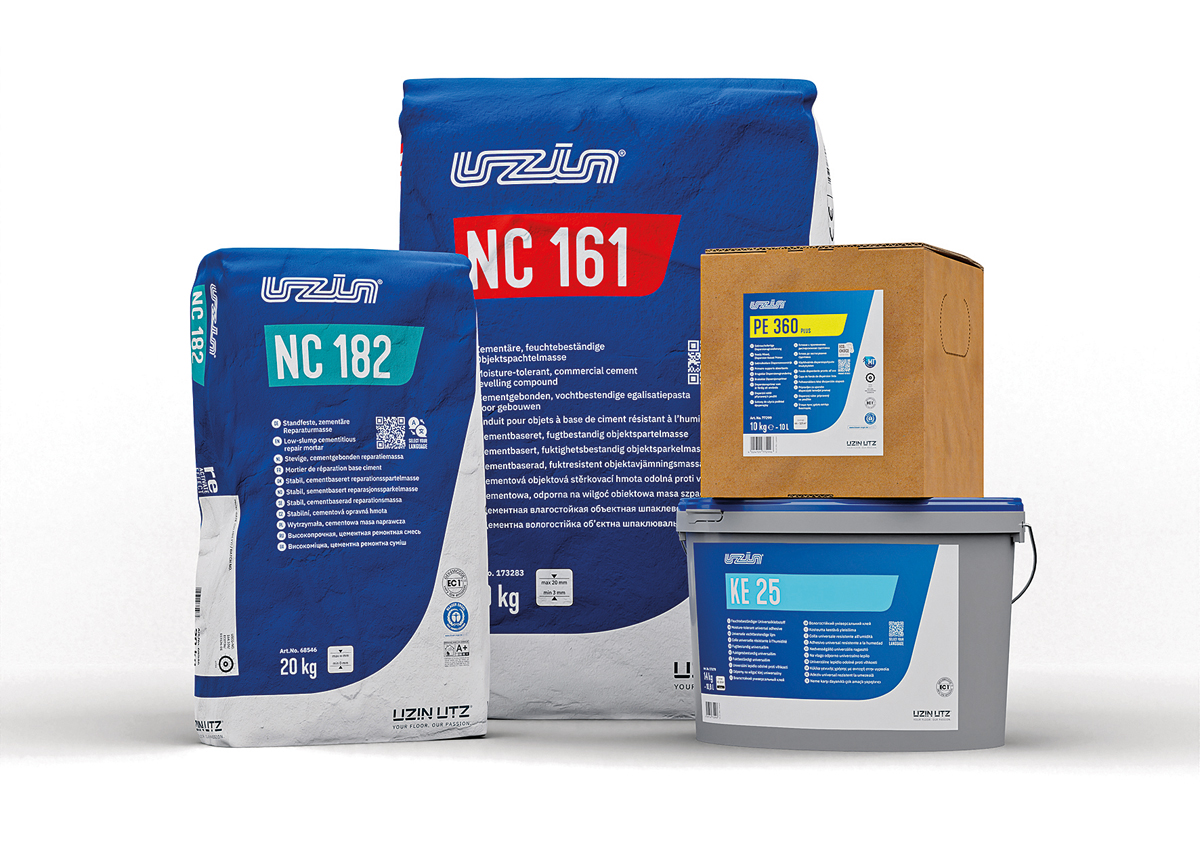 Das »Uzin MT Classic System« beispielsweise setzt sich aus zwei neuen und zwei bestehenden Produkten zusammen – der Dispersionsgrundierung »Uzin PE 360 Plus«, der standfesten Reparaturmasse »Uzin NC 182«, der neuen zemen-tären Spachtelmasse »Uzin NC 161« und dem neuen Universalklebstoff »Uzin KE 25«. Das System eignet sich insbesondere auf feuchten zementären Untergründen und kommt ganz ohne Feuchteabsperrung oder -bremse aus. Der Grund: Die alkalische Feuchtigkeit beeinträchtigt weder die einzelnen Produkte noch den gesamten Systemaufbau.