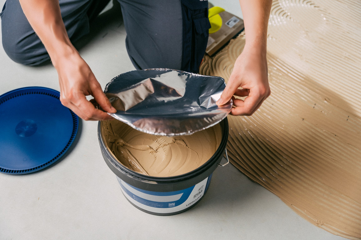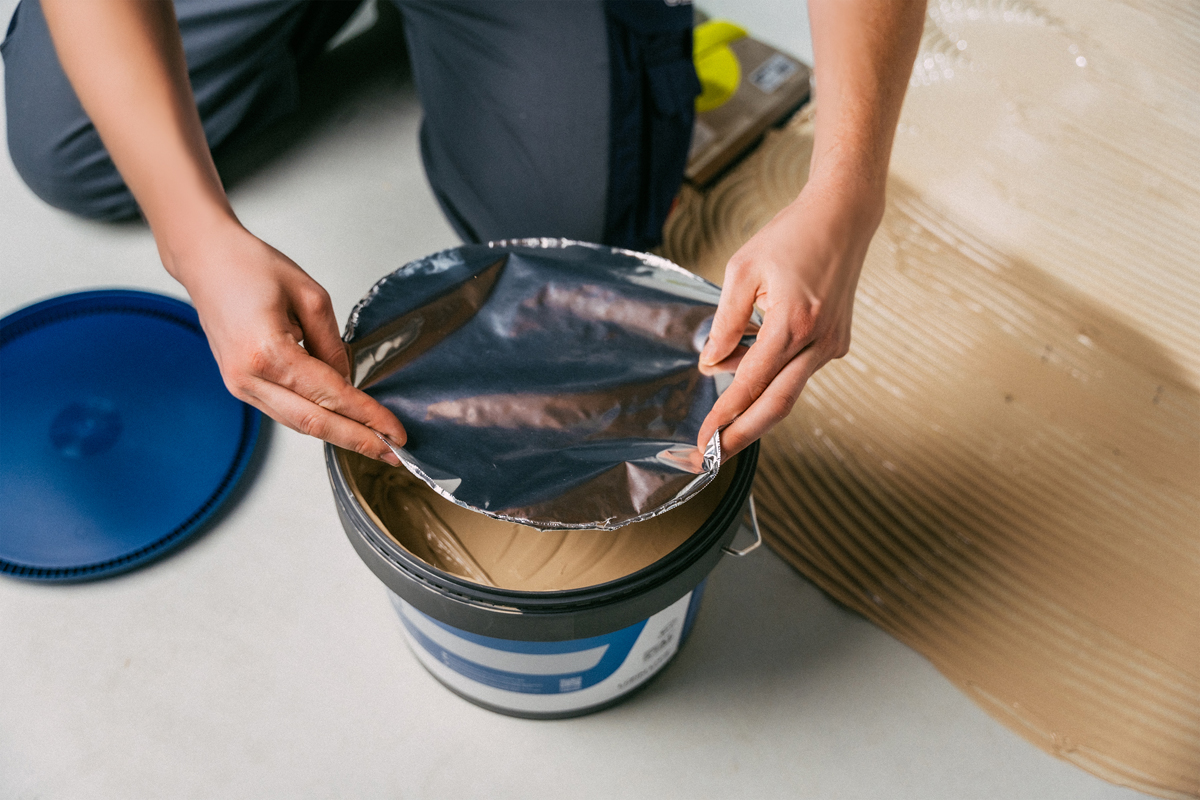 »Uzin iQSeal« schließt am Deckelrand dicht ab und lässt sich an einer Lasche leicht öffnen. Der Inhalt härtet nicht aus und kann für einen weiteren Einsatz verwendet werden – bei konstanter Klebstoffqualität. Weitere Hilfsmittel sind nicht erforderlich.