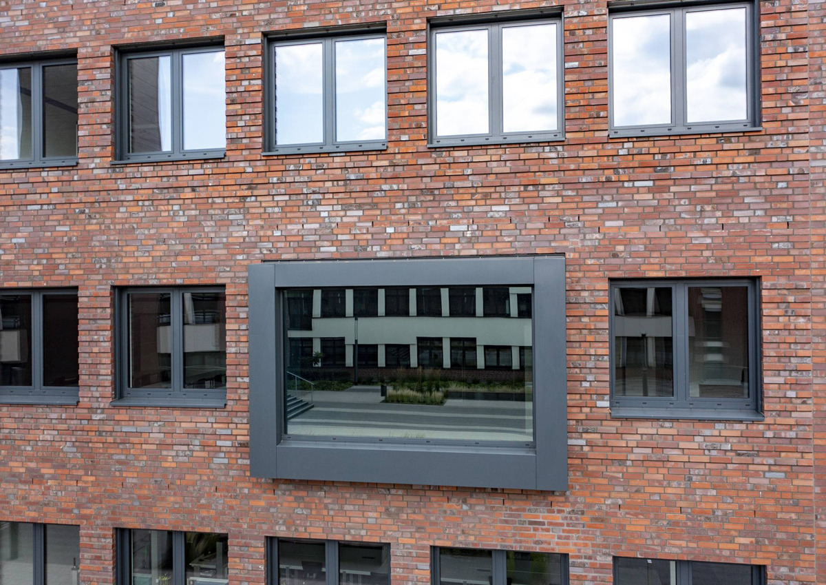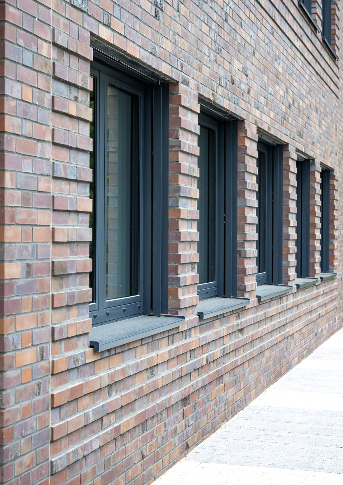 Als es um die Auswahl des Fassadenmaterials für den Neubau ging, formulierten die Architekten klare Kriterien. Ein hochwertiger Klinker sollte es sein, Grundfarbe Rot, rustikale Wirkung und frei von Engoben. Für das Projekt in Kleve favorisierte das Architektenteam in Anlehnung an die Bestandsbauten eine hellere Farbgebung, zugleich sollte das Material eine charakterstarke Ausstrahlung mitbringen. Während der Bemusterung präsentierte Vandersanden-Fachberater Matthias Jansen unter anderem auch Ringofenklinker, die Vandersanden nach wie vor in traditioneller Handwerkskunst herstellt. »Ringofenklinker aus vorwiegend manueller Produktion auch in großen Mengen pünktlich bereit zu stellen, damit haben wir bei Vandersanden Erfahrung«, berichtet Jansen. Und so fiel die Entscheidung auf »Alt Krakow« im Format NF (240 x 115 x 71 mm). Vom Farbbild her eine nuancierte Mischung aus Rot, Braun, Violett und Anthrazit, erzeugt die Zugabe von Kohle im Ofen Oberflächenstrukturen mit einzigartigen Effekten.