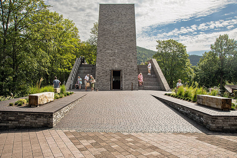 Weithin sichtbares Merkmal des neuen Besucherzentrums ist der Eingangsbereich, der als stilisiertes Mauerstück wie aus dem Boden herausgewachsen erscheint. Mit der in Steinoptik gehaltenen Materialität der Böden und Wände sowie dem Blick in den nach oben offenen, zehn Meter hohen Turm beginnt sich das »Innengefühl« zu entfalten.