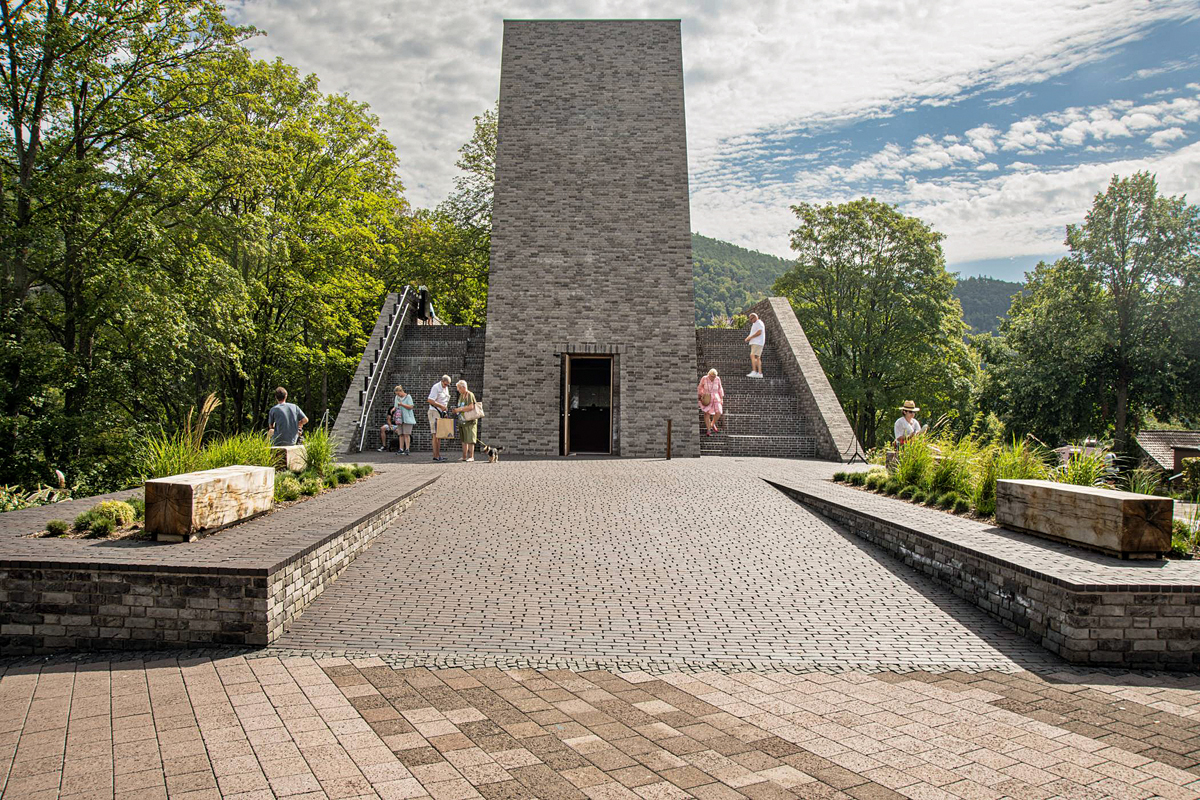 Deutlich einfacher als die Suche nach einem farblich exakt passenden Fassadenbild gestaltete sich die Entscheidung, mit welchem Material die Außenflächen in der Umgebung des Besucherzentrums befestigt werden sollten. Der Umfang der Bodenpflasterung von Vorplatz und Treppenanlagen summiert sich zwar nur auf den vergleichsweise kleinen Wert von 420 m2; das Material muss aber in der Lage sein, über Jahrzehnte hinweg den Ansturm Abertausender Menschen schadlos zu verkraften. Für Christoph Hesse kamen nur Pflasterklinker infrage, die farblich mit dem Fassadenbild harmonieren und sich gut in das Gesamtbild einfügen. Die Wahl fiel auf Pflasterklinker der Sorte »Modena Antica« aus dem Sortiment von Vandersanden. Im Strangpressverfahren hergestellt, überzeugen die Klinker mit einem gleichmäßigen Erscheinungsbild und der ausdrucksstarken Farbwirkung der Nuancen von Schwarz und Braun. Im Format WF60 (204 x 50 x 60 mm) verlegt, unterstreichen sie mit ihrer gleichmäßigen Optik die Modernität der gesamten Anlage.
