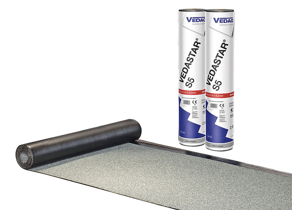 Die 5,2 mm dicke Bahn besteht aus drei Schichten: An der Oberseite aus beschiefertem Elastomerbitumen mit einem bestreuungsfreien Längsrandstreifen. Als Trägereinlage hat »VedaStar S5« ein hochreißfestes und zugleich dehnfähiges Polyestervlies mit Glasfadenverstärkung mit einem Flächengewicht von 300 g/m² verwendet. Die Unterlage bildet Elastomerbitumen mit Rillenprägung und einer leicht abschmelzbaren Folie. Aufgrund dieser mit Schnellschweiß-Bitumen ausgerüsteten Bahnenunterseite lässt sich die Bahn laut Hersteller besonders schnell und wirtschaftlich verschweißen. Zusätzliches Schnellschweiß-Spezialbitumen und eine leicht abflämmbare PP-Folie auf der Bahnenunterseite steigern die Verlegeeffizienz zusätzlich.