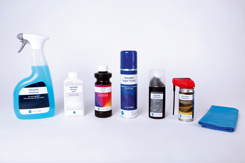 Mit »Vekapro DailyClean« steht ein Universalreiniger für die regelmäßige Reinigung des gesamten Fensters zur Verfügung: Er lasse sich bedenkenlos für Glas und Rahmen nutzen, sowohl für farbig foliierte als auch für weiße Kunststoffprofile. Mit diesem Mittel könnten Fensterhersteller ihren Kunden ein einfach zu nutzendes Mittel für die Pflege ihrer Fenster an die Hand geben. Denn viele Verbraucher wissen nicht, dass aggressive Glasreiniger oder zweckentfremdete Reinigungsmittel, die Säure enthalten, dauerhaft Schaden anrichten können, wenn nach der Reinigung Rückstände auf dem Kunststoffrahmen zurückbleiben.
