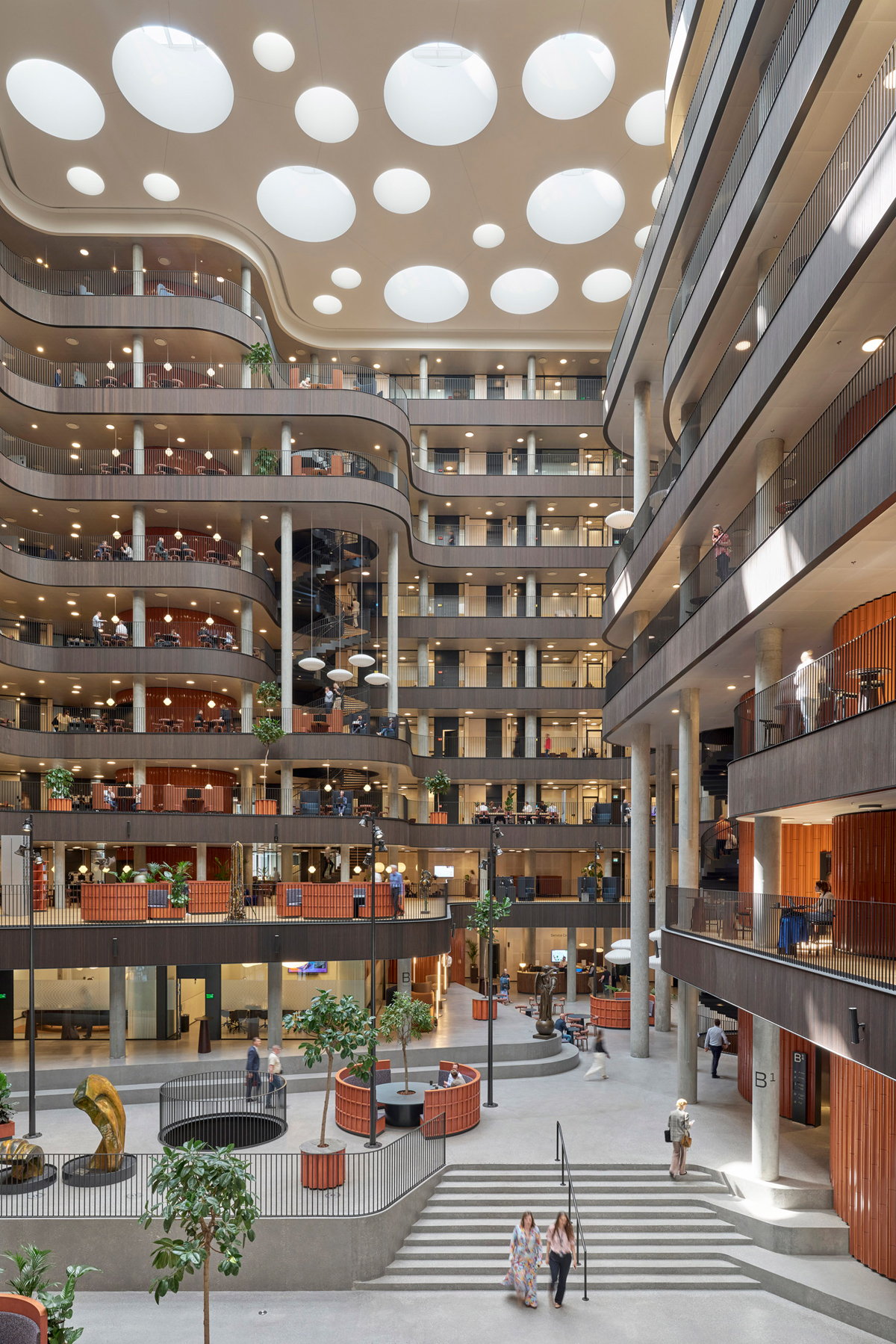 Diese traditionellen Elemente der Danske Bank werden durch moderne, großzügige Glasflächen ergänzt, die für eine offene und lichtdurchflutete Atmosphäre sorgen. Die beiden Atrien fungieren als zentrale Knotenpunkte. Das größere der beiden beeindruckt mit einer Höhe von 43 m und überspannt zehn Stockwerke. Wer das Foyer betritt, trifft auf eine weiche, organische Formenwelt. Um das große Atrium herum gliedert sich das Gebäude in Zonen mit unterschiedlichen Arten von Arbeitsplätzen. Draußen an der Fassade befinden sich ruhigere Büros für konzentriertes Arbeiten. Zur Mitte des Gebäudes hin sind Bereiche für Kollaboration und Austausch platziert. Die Geschäftsführung befindet sich im zweiten Stock in der Nähe des belebten Gehwegs, der die beiden Gebäude verbindet. In dem kleineren Gebäude befindet sich die Händleretage der Bank.