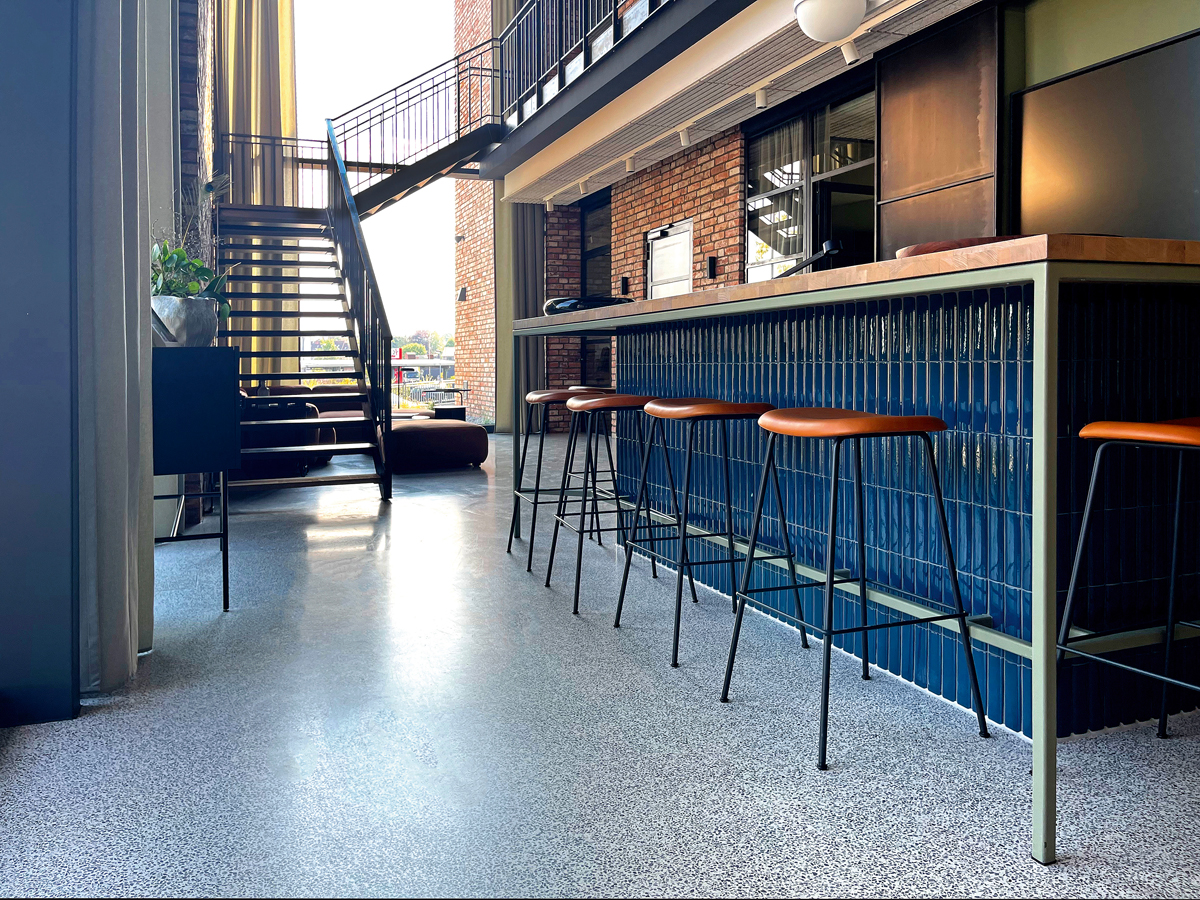 Der »Via Terrazzo« ist auf die Ansprüche moderner Bau- und Sanierungsmaßnahmen ausgerichtet und zu 100 Prozent recyclingfähig, denn der traditionelle, fugenlose und natürliche Bodenbelag besteht aus Sand, Kalk und Gesteinskorn. Gemischt wird die Terrazzomischung eimerweise mit Wasser und dann direkt aufgespachtelt.