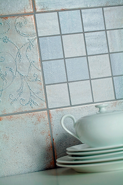 Traditionsreiche Fliesenkunst spiegelt sich in den aufwändig gestalteten Oberflächen von »Manufactura« wider. Das feine Relief der floralen Ornamente, die schimmernden Mosaike und nicht zuletzt die typischen Zeichen der Zeit, die sich an den Randbereichen der Wandfliesen darstellen, versorgen diese Serie mit einem besonderen Charme.