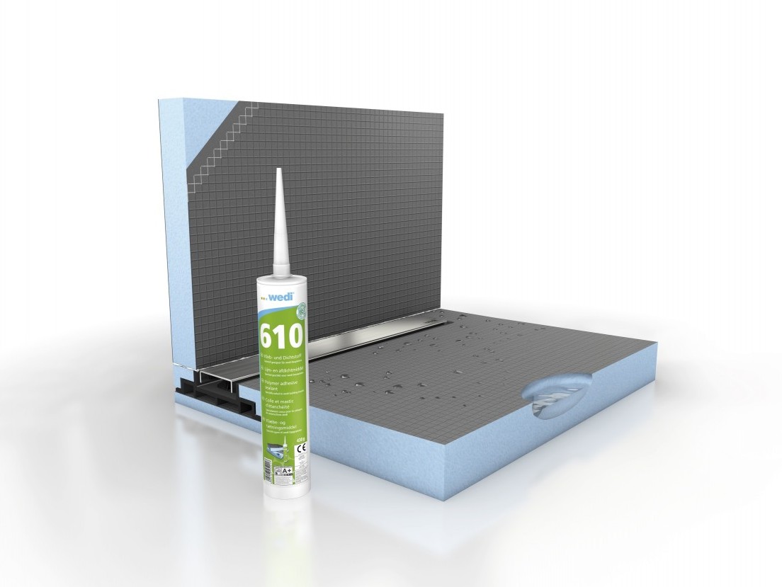 Die Kombination aus wedi 610 mit den wedi Bauplatten und den wedi Duschsystemen erfüllt das allgemeine bauaufsichtliche Prüfzeugnis (abP) für den hochbeanspruchten Bereich und findet darum auch in Saunen oder anderen Bereichen mit hoher Feuchtigkeitsbelastung Anwendung. Die wasserdichte Verklebung gibt maximale Sicherheit bei minimaler Verarbeitungszeit und spart so für den Verarbeiter Zeit, da keine weitere Abdichtung notwendig ist. wedi 610 ist stark haftend, früh wasserbeständig und besitzt eine ausgezeichnete Witterungs- und Chemikalienbeständigkeit. Zudem ist er lösemittel-, silicon- und PCP-frei und weist einen geringen Schrumpf auf. Diese Vielzahl an Eigenschaften macht wedi 610 zum idealen Werkstoff für Projekte im Nassraum.