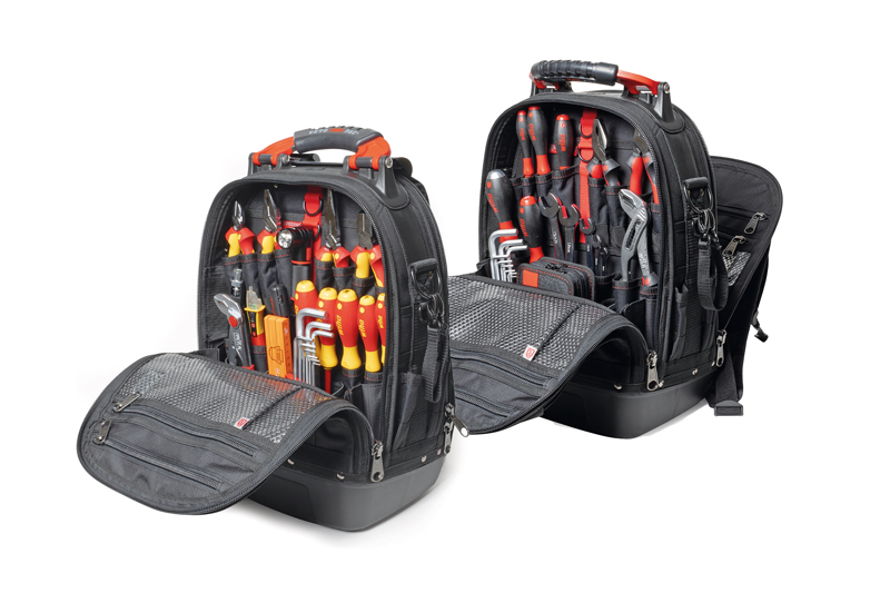 Je nach mechanischem oder elektrischem Anwendungsschwerpunkt variiert die Auswahl. Während sich im »Electric«-Set spannungssichere, ergonomische Schraubendreher und Zangen, Stiftschlüssel, Abisolierwerkzeug und weiteres Elektriker-Grundequipment befinden, beinhaltet die »Mechanic«-Version u. a. Ringratschen-Gabelschlüssel, einen Schlosserhammer bis hin zu einem umfangreichen 1/4" Sechskant Steckschlüssel- und Bit-Set.Ein ausziehbarer Haken ermöglicht, dass der Rucksack aufgehängt werden kann, was die Werkzeugentnahme für den Anwender komfortabler und rückenschonender macht, da er sich nicht mehr bis zum Boden bücken muss. Ebenso punktet die Aufhänge-Möglichkeit laut Hersteller Wiha in Sachen Sauberkeit, Effizienzsteigerung und Zeitersparnis.