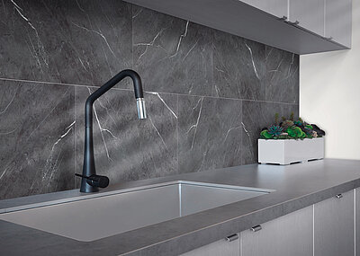 Die Aluminium-Verbundplatten besitzen zwei Aludeckschichten und einen schwarzen Kern aus Polyethylen. Die harte Oberfläche ist abrieb- und kratzfest und bietet Wasserfestigkeit. Die hygienischen Oberflächen sind leicht zu reinigen, denn Schmutz oder Kalk können sich kaum festsetzen, und somit sind die Platten gut geeignet für Anwendungen in Feuchträumen wie Bad und Küche. Aber auch in Büroräumen und Wohnzimmern sind die Platten ein Hingucker.