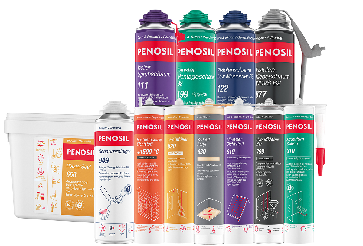 Die globale Marke »Penosil« wird in mehr als 60 Ländern vertrieben. Die Produkte sind in neun Kategorien unterteilt, die sich jeweils durch die Farbe der Verpackung unterscheiden lassen. Die Produkte der Kategorie »Allgemeines Bauen« sind dunkelblau, die Produkte der Kategorie »Fenster und Türen« grün, die Produkte der Kategorie »Dekoration« gelb. »Handwerker haben schon lange auf ein einfaches und logisches System gewartet, das es ihnen erleichtert, die richtigen Produkte für ihre Anwendung zu finden«, so das Unternehmen. »Penosil« richtet sich an professionelle Anwender, Heimwerker und die Industrie.