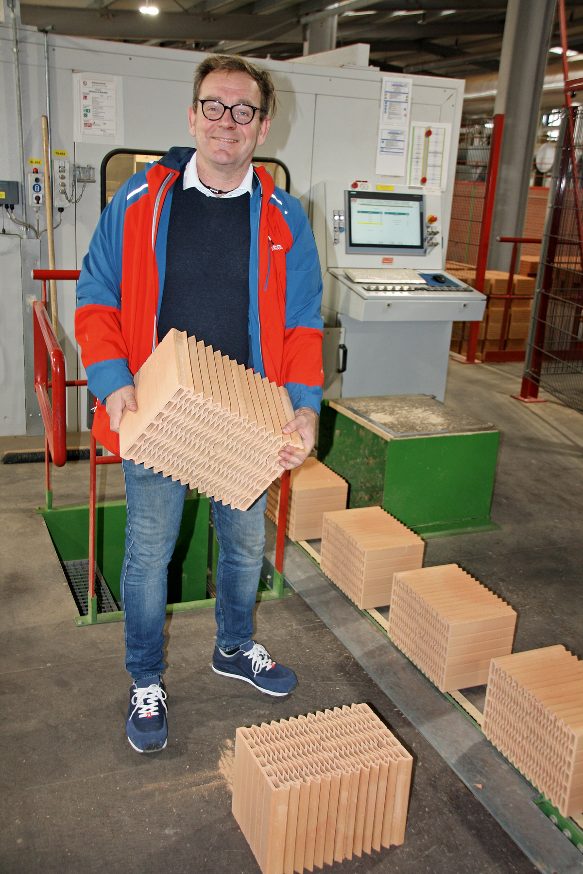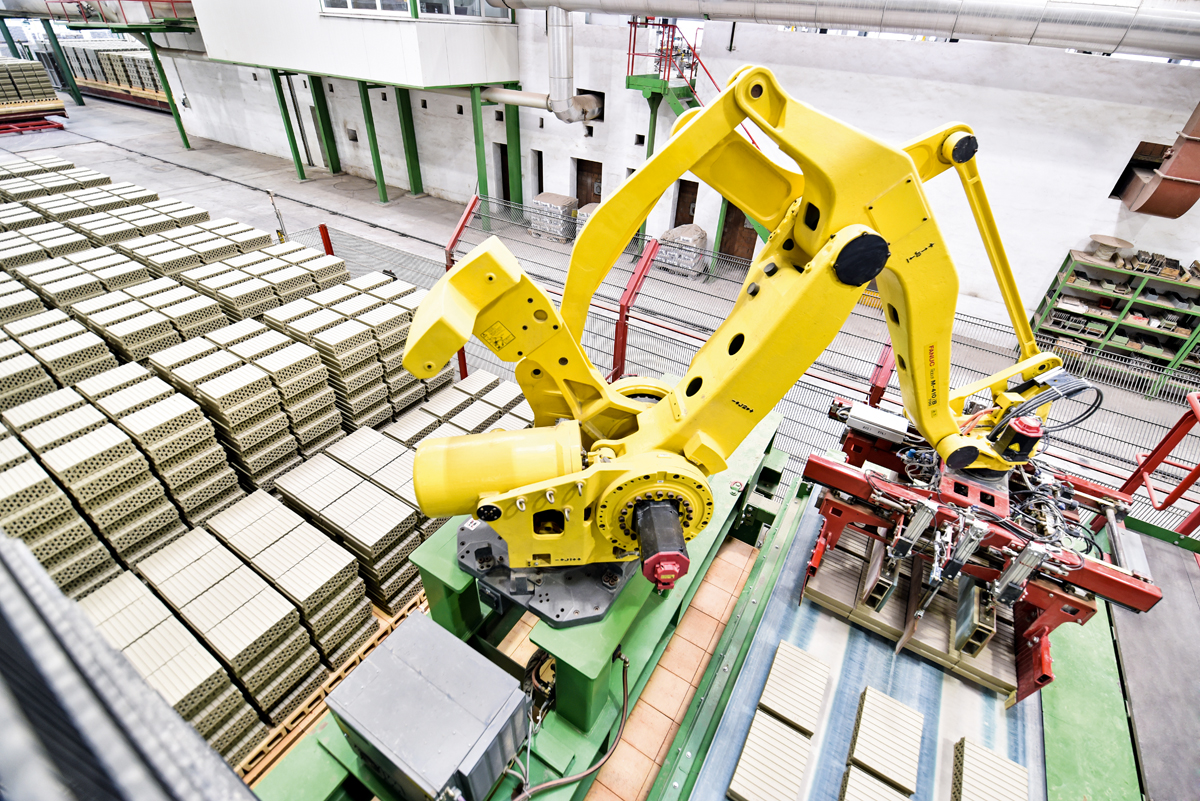 Wer nie eine Ziegelproduktion hautnah erlebt hat, stellt sich diese wohl mit viel Staub, Schmutz und harter körperlicher Arbeit vor. Michael Kellerers Produktion dagegen hat IoT-Standard, wie er betont. Alle Maschinen sind miteinander vernetzt, elf Roboter übernehmen die schweren Lastarbeiten, die Kontrolle und Steuerung der Anlage erfolgt über verschiedene Rechner, über die der Zustand jeder Maschine exakt nachverfolgt werden kann. »Ich kann die Anlage sogar per Handy steuern«, sagt Michael Kellerer, der vor etwa zehn Jahren damit begann, seinen Plan einer vollautomatisierten, vernetzten Ziegelproduktion in die Tat umzusetzen. Die an 5,5 Tagen pro Woche im Zwei-Schicht-Betrieb eingesetzten Mitarbeiter können sich ganz auf die Steuerung und Überwachung des Produktionsablaufs konzentrieren.