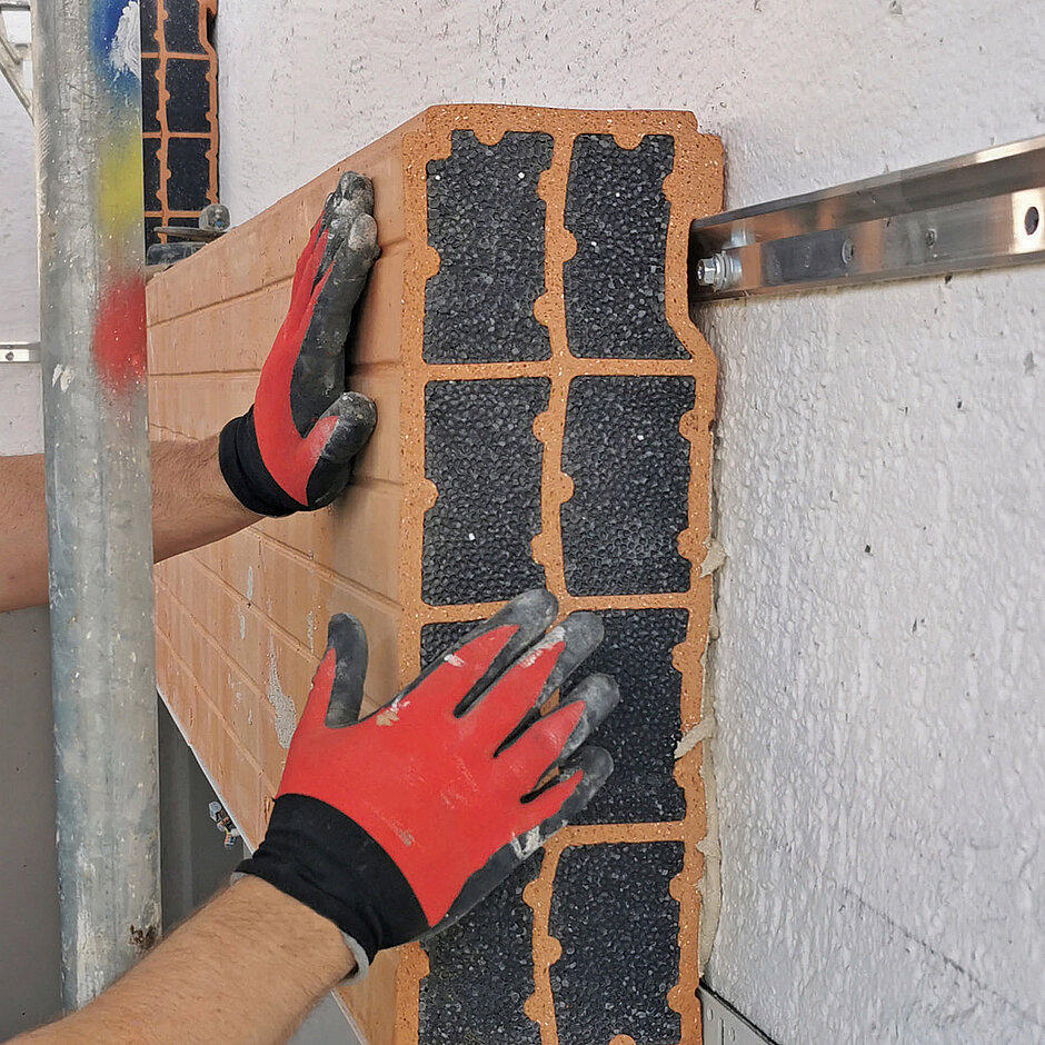 Die einfache und schnelle Montage erfolgt direkt auf der alten Außenwand, wahlweise im Direktanschluss an eine Perimeterdämmung oder ohne Sockel mit einer Sockelabschlussschiene. Eine Vorbereitung der Bestandswand oder das Entfernen des alten Putzes sind in der Regel nicht erforderlich. Die Befestigung erfolgt zeilenförmig alle 50 cm mittels einer Profilschiene aus Aluminium. Dort werden die Elemente eingehängt und die einzelnen Reihen der Fassadenelemente mit Dünnbettmörtel verbunden. Zur Aufnahme von Windsog und -druckkräften sowie zur Vermeidung einer Hinterlüftung werden die Elemente zusätzlich rückseitig mit Klebemörtel im Punkt-/ Wulstverfahren befestigt.