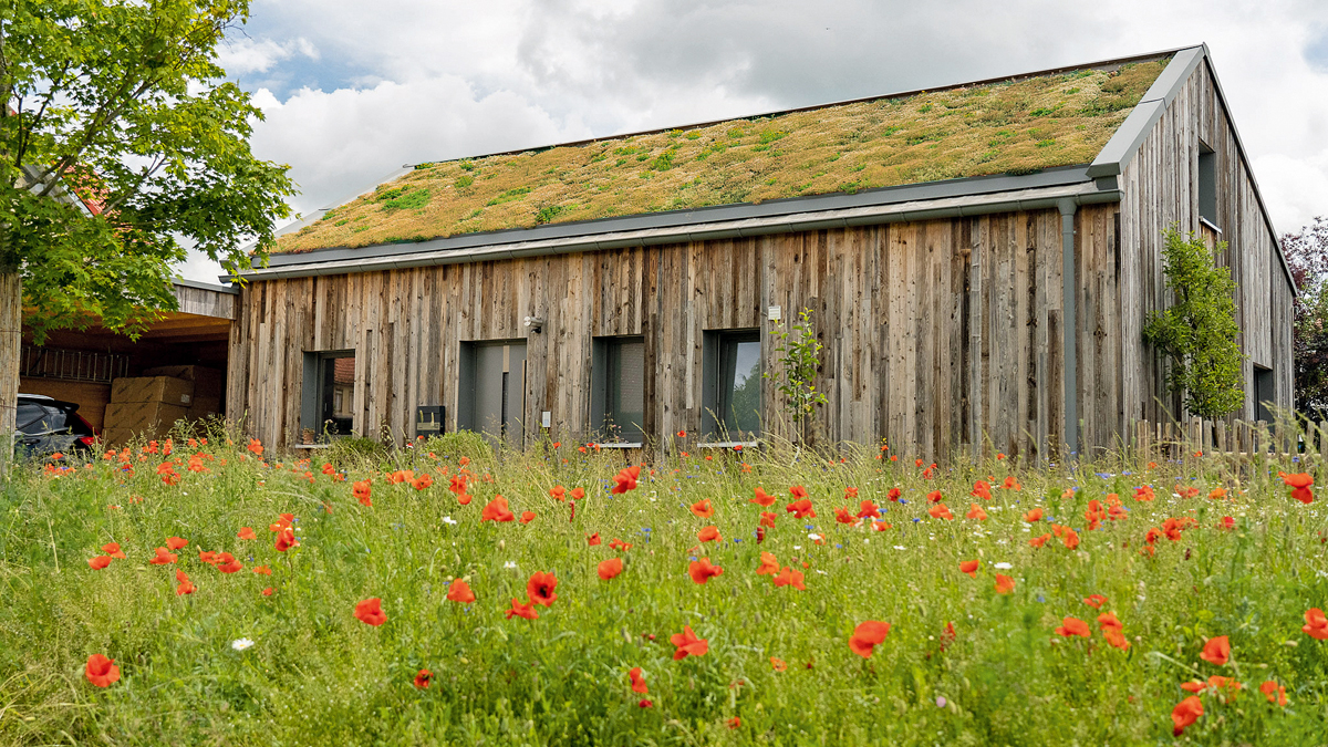 Das begrünte Holzhaus liegt direkt an der Dorfstraße und führte schon zu einigen spontanen Anfragen von begeisterten Durchreisenden. Der naturnah gestaltete Garten mit Stauden, Teich sowie kaum versiegelten Terrassenflächen spiegelt das ganzheitliche Grünkonzept und ist ein Beispiel gelebter Klimaresilienz, und zwar von Kopf bis Fuß beziehungsweise vom Dach bis zum Boden. Autorin: Frau Reidel