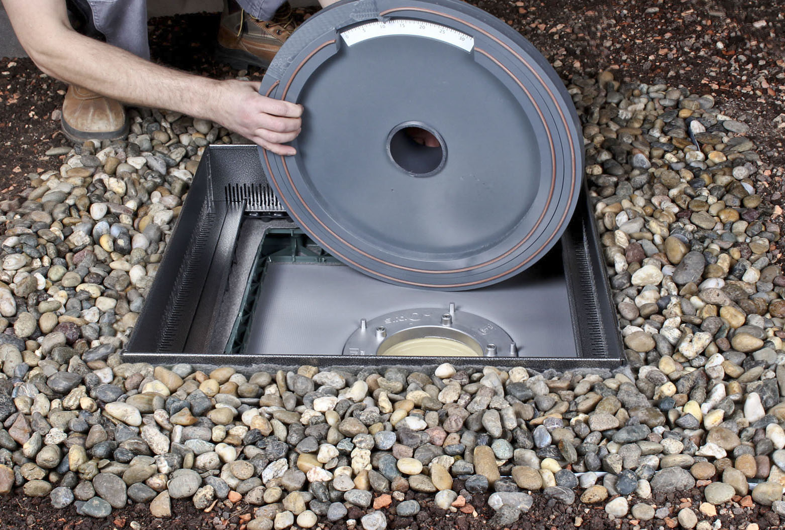 Das Regenwasser fließt von Beginn an über das präzise regulierbare Drosselelement langsam in Dachgully und Fallleitung. Fällt schneller Regen als Wasser abfließt, füllt sich das Einstauvolumen. Die genaue Abflussmenge lässt sich übrigens durch gegeneinander verschiebbare Ringe an der Drossel einstellen. Üblicherweise wird die Einstellung so gewählt, dass das Dach nach 24 bis 48 Stunden wieder leer ist, aber auch andere Einstellungen sind möglich. Die maximale Anstauhöhe ist mit einem Gewinde einstellbar und die verbleibende Öffnung lässt Überschusswasser in die Fallleitungen abfließen, sofern es mehr regne, als angestaut werden kann. Damit all dies einwandfrei funktioniert, liegen Gully samt Drosselelement geschützt innerhalb eines Kontrollschachts, dessen Feinschlitzung das Einschwemmen von Fremdstoffen verhindert.