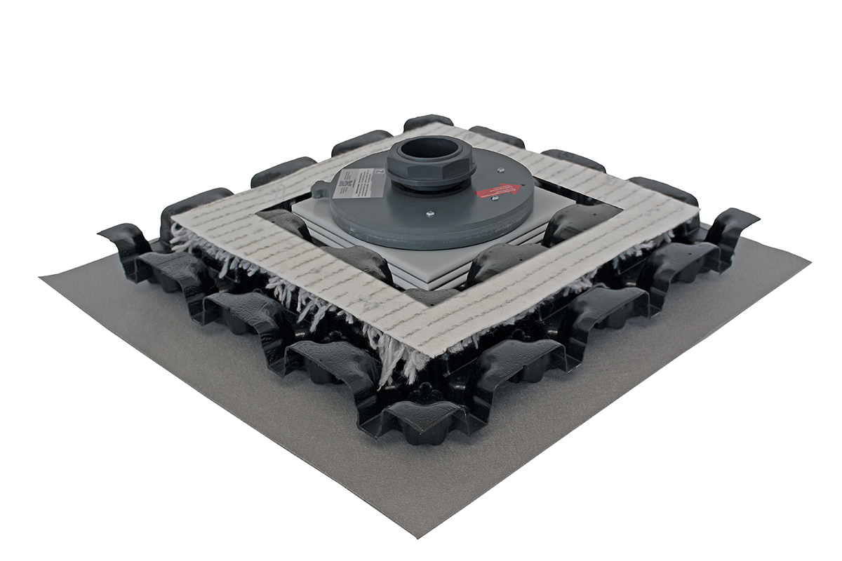 Das »Retentions-Gründach« ist grundsätzlich auf die örtliche Regenspende (Extremregenereignisse nach Kostra-Atlas), auf vorhandene Einleitungsbeschränkungen, auf statische Lastreserven und Dachgegebenheiten wie Lichtkuppeln usw. auszulegen. Daraus resultieren Rückhalte- und Abflussmengen und diese bestimmen im Endeffekt die gewünschte Höhe des Stauraums. Um die Anstauhöhe zu realisieren, hat ZinCo verschieden hohe und druckstabile Spacer-Elemente im Programm. Der Retentions-Spacer »RS 60« beispielsweise, für den Einsatz unter Extensivbegrünungen, ist 60 mm hoch und ermöglicht laut Hersteller eine zusätzliche Speicherung von annähernd 60 l/m² Wasser auf dem Dach. Dieser Spacer hat in Sachen Transport und Lagerung den Vorteil, dass die Elemente ineinander stapelbar und daher platzsparend sind. Daneben gibt es für den Einsatz unter Intensivbegrünung sowie unter Geh- und Fahrbelägen die druckstabilen Retentions-Spacer »RSX 65, 80, 100 und 150«, die eine entsprechende Wasserspeicherung von bis zu 150 l/m² Wasser realisieren. Sind Einstauhöhen dazwischen oder darüber hinaus gefragt, bietet ZinCo ebenfalls objektgerechte Lösungen.