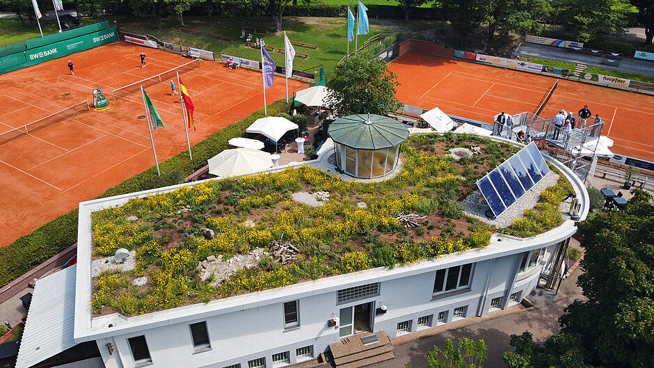 Das um 1950 erbaute einstöckige Clubhaus-Gebäude besticht durch seine halbseitig runde Form und seine bodentiefe Fensterfront. Optisch weniger attraktiv war sein frei bewittertes Bitumendach. Dafür beherbergte dieses einige Solarthermie-Module, die warmes Wasser lieferten. Diese Module sollten auch in der Begrünung wieder ihren Platz bekommen. Das stand nach der ersten Abstimmung des KETV-Vorstandes Wolfgang Senn mit dem Dachbegrünungshersteller Zinco genauso fest wie die Tatsache, dass es statt einer klassischen Extensivbegrünung zukunftsweisend ein Biodiversitäts-Gründach werden soll. Für die Begrünung konnte der KETV Zuschüsse bei der Stadt sowie dem Badischen Sportbund beantragen.