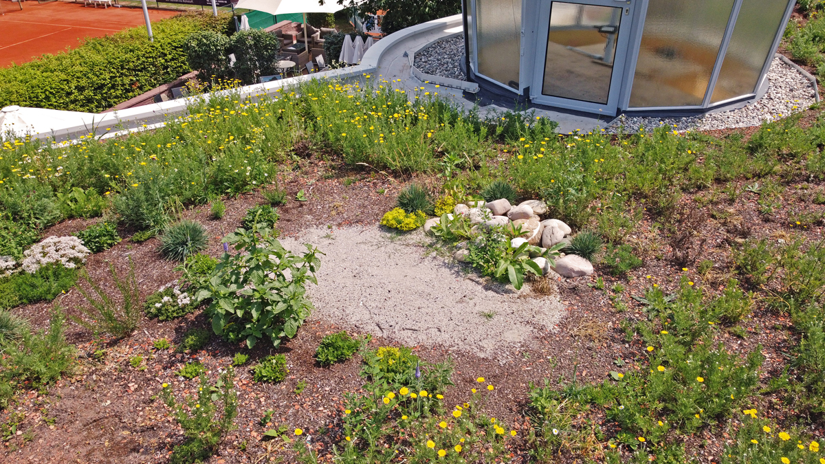Eine breite Palette an Biodiversitäts-Modulen ergänzt die Bepflanzung, damit Insekten, Schmetterlinge und Vögel nicht nur Futter finden, sondern auch artgerechte Nistplätze und Rückzugsbereiche. Deswegen wurden mehrere vegetationsfreie Flächen wie Sandlinsen, Grobkiesbeete, Steinanhäufungen und Totholz realisiert. Zu einem Biodiversitätsdach gehört zudem eine kleine Wasserfläche, die als Vogel- und Insektentränke dient. Zu guter Letzt sind zwei Nisthilfen für Insekten installiert.