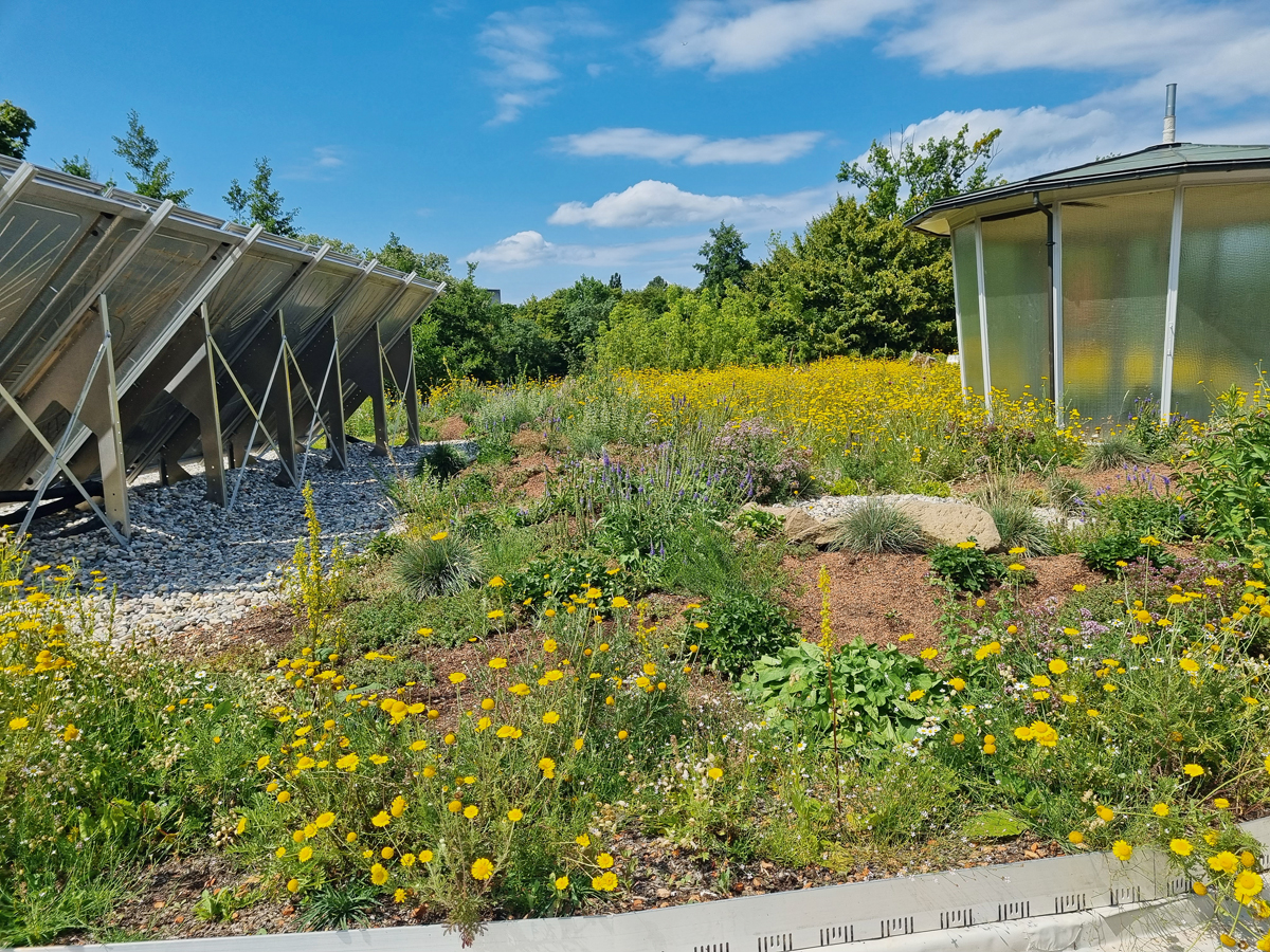 Auf der Suche nach einer Sanierungslösung für die rund 235 m² große Dachfläche war schnell eine Dachbegrünung in der Planung, weil diese neben einer schönen Optik weitere Pluspunkte bietet: Verlängerung der Dachlebensdauer durch Schutz der Bausubstanz, Wärmedämmung, Schallschutz, Bindung von Feinstaub und Schadstoffen etc. Hinzu kommt der ökologische Nutzen, zumal durch die Kooperation mit Zinco das erste Biodiversitäts-Gründach in Karlsruhe entstanden ist, das immensen Artenreichtum von Flora und Fauna bietet.