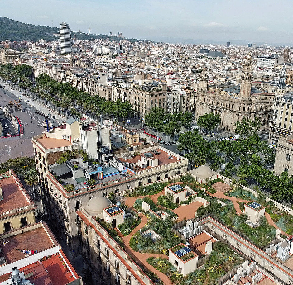 Porxos d’en Xifré ist ein aus insgesamt zehn Gebäuden bestehender ikonischer Gebäudekomplex aus dem frühen 19. Jahrhundert – eine echte Sehenswürdigkeit Barcelonas, da die Familie Ruíz-Picasso mit Künstlergenie Pablo Picasso im Jahre 1895 eine der Wohnungen des Porxos d’en Xifré bezog.Das begehbare Dach ist ein wunderbarer Rückzugsort, eine eigene Welt inmitten der umtriebigen Stadt. »Diese Flachdächer sind leider oft ungenutzt«, weiß Sergio Carratalá Lamarca, CEO des Architekturbüros MataAlta Studio. »Als Architekt fragen wir uns immer: Wie können wir die Natur wieder in die dicht besiedelten urbanen Gebiete bringen? Unsere Mission ist das ›Rewilding‹, also die Rückführung unserer stark bebauten Welt in ihren natürlichen ökologischen Zustand.«