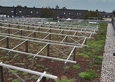 In den späteren Pflanzbereichen kam als Abdeckung »Aquafleece AF 300« zum Einsatz. Auf diesem hochkapillaren Vlies aus Polyacrylfasern sind im Abstand von rund 50 cm Tropfschläuche mit Klettbändern befestigt, die der Unterflurbewässerung dienen. In Trockenzeiten wird das in der Zisterne gesammelte Regenwasser in die Tropfschläuche gepumpt und von dem Aquafleece flächig von unten im Substrat verteilt. Erst wenn das Aquafleece und das Substrat wassergesättigt sind, gelangt es durch das Aquafleece hindurch in die darunterliegende Drainschicht. So steht den Pflanzen stets genügend Wasser zur Verfügung. Passend für die Bepflanzung schüttete man hier die Zinco-Systemerde »Dachgarten« in einer Höhe von 30 bis 40 cm auf.