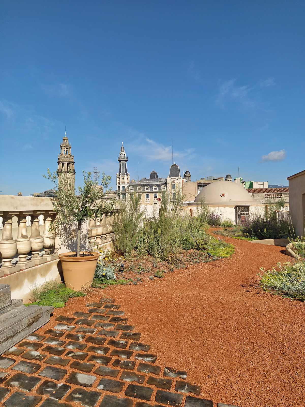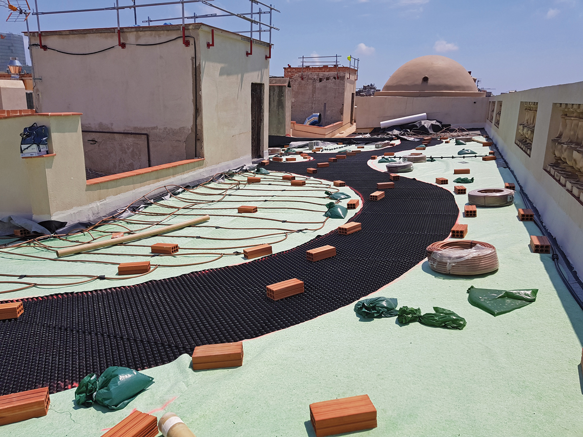 Der Dachgarten selbst wurde genau so ausgelegt, dass keine Zusatzmaßnahmen in Bezug auf die Statik erforderlich waren. Auch die Baumaterialien wurden sorgfältig ausgewählt, um den CO2-Fußabdruck zu verringern. So wurde z. B. recycelter Tonziegelsplitt für die Dachgartensubstrate verwendet, natürlicher Kalkmörtel für die Mauerarbeiten, und Altholz wurde aus dem Gebäude für die Belagsflächen gewonnen. Das gesamte Projekt ist von Kreislaufwirtschaft gekennzeichnet und in hohem Maße autark. So sichern etwa Photovoltaikmodule auf den Treppenhausdächern die Energieversorgung und speisen Stromüberschuss in das städtische Netz. Auch die Ressource Wasser wird intelligent genutzt. Überschüssiges Regenwasser vom Dach fließt nämlich nicht in die Kanalisation, sondern wird in einer unterirdischen Zisterne gesammelt und für die Bewässerung des Dachgartens während der Sommermonate verwendet. Das Dach ist als sogenanntes »Katalanisches Dach« gebaut, ein belüftetes Kaltdach mit mehreren Schichten typisch katalanischer Keramikplatten. Charakteristisch ist also ein Hohlraum, durch den die Luft zirkulieren kann. Über die Gesamtfläche ist das Dach unterschiedlich geneigt, in einigen Bereichen bis etwa 5°. Der Ausführungsbetrieb Eix Verd verlegte auf dieser Grundlage als erste Lage im Zinco-Systemaufbau die Speicherschutzmatte »SSM 45« und darauf die Drain- und Wasserspeicherelemente »Flordrain FD 40«. Diese 40 mm hohen Elemente aus tiefgezogenem Recycling-Polyolefin speichern Wasser in ihren Mulden und leiten Überschusswasser dank unterseitigem Kanalsystem sicher ab. Auf diese vollflächig verlegte Drainschicht folgten in den Gehbereichen das Systemfilter »SF« als Abdeckung sowie rund 10 cm Ziegelsplitt »Zincolit«. In den Terrassenbereichen ist »Zincolit« teilweise mit Pflastersteinen kombiniert und an anderer Stelle mit Holzhäcksel gemischt.