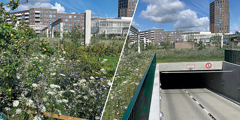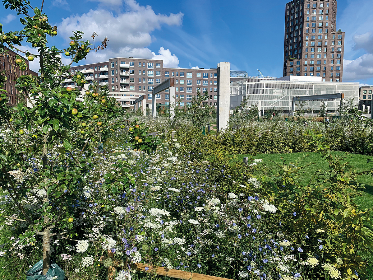 Neben diesen 1 000 m² Belagsfläche sind 8 000 m² üppig grün gestaltet. Die weitläufigen Rasenflächen sind mit vorkultiviertem Rollrasen begrünt und in den Bereichen mit Wiesenblumen wurden diese als Samenaussaat ausgebracht. Dazu schafft die Gemeine Hainbuche als Heckenpflanze gewisse Abgrenzungen. Die eigentlichen Hauptdarsteller im Pflanzkonzept sind stattliche 250 Obstbäume – Äpfel, Birnen, Pflaumen – die von den Bewohnern und Parkbesuchern geerntet werden dürfen. Wichtig bei deren Pflanzung war ihre sichere Verankerung auf der Dachfläche. Dazu verlegte man entsprechende Stahlgitter auf den »Floradrain«-Elementen und konnte daran die Wurzelballen mit Spannbändern sichern. Aktuell wird der Grønttorvet-Park übrigens weiter ausgebaut und soll auch eine Wasserfläche erhalten.
