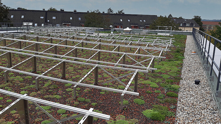 Synergieeffekte durch die Kombination von Grün und Solar gibt es nicht nur bei der Installation, sondern auch im laufenden Betrieb. Die Pflanzen sorgen für eine kühlere Umgebungstemperatur und steigern damit den finanziellen Ertrag der Solaranlage. Diese produziert rund 56 000 kWh Strom pro Jahr, wovon etwa 26 000 kWh direkt in der Kita verbraucht werden und der Rest in das öffentliche Stromnetz eingespeist wird.