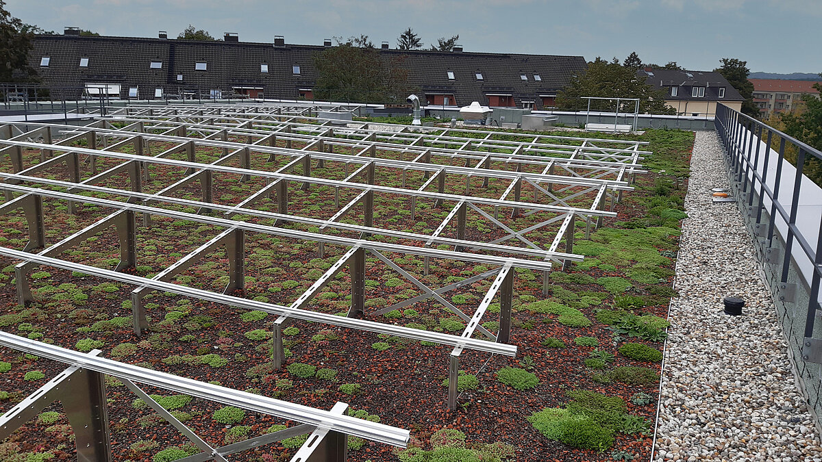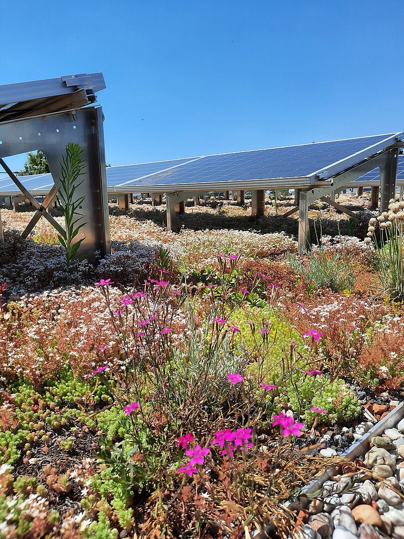 Passend zur gewünschten artenreichen Extensivbegrünung wurde die Zinco-Systemerde »Steinrosenflur« ausgebracht. Da das Substrat die Auflast für die Verankerung der Solaranlage und der Geländer darstellt, ist sein Gewicht im Trockenzustand entscheidend. Für den gesamten Solarbereich bot sich eine Sedumsprossenaussaat an, da hier niedrig wachsende Pflanzenarten gefragt sind, um die Module nicht zu überwuchern. Auf der übrigen Fläche ergänzten Flachballenpflanzungen die Sprossenaussaat, wobei sowohl die Pflanzengemeinschaft »Steinrosenflur« als auch die Pflanzengemeinschaft »Bienenweide« eingesetzt wurden. So fühlen sich zum Beispiel Schafgarbe, Schnittlauch, Oregano und Kamille auf dem Dach sehr wohl. Für Bienen sind unterschiedliche Futterpflanzen sehr wertvoll, deren Blütenzeiten sich vom zeitigen Frühling bis in den späten Herbst erstrecken.