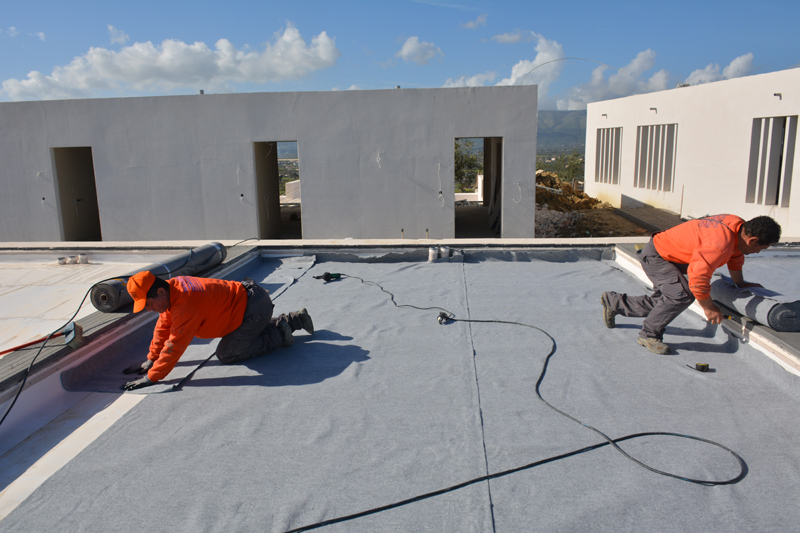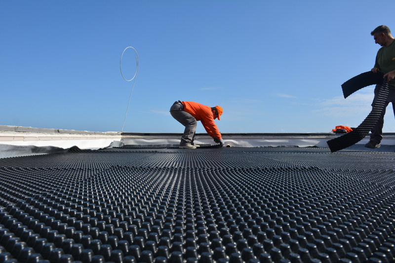 Die in Griechenland tätige ZinCo-Partnerfirma egreen lieferte sämtliche Materialien auf die Baustelle. Zu diesem Zeitpunkt waren die 1,5% geneigten Gebäudedachflächen bereits mit 150 mm EPS wärmegedämmt und mit einer 1,5 mm starken wurzelfesten Dachabdichtung aus thermoplastischem Polyolefin versehen. Auf dieser Basis startete der ZinCo-Systemaufbau mit der Trenn- und Schutzmatte TSM 32, einer Synthesefasermatte zum Schutz der Abdichtung vor mechanischer Einwirkung. Darauf folgte das 25 mm hohe Drän- und Wasserspeicherelement Floradrain FD 25 aus tiefgezogenem Recycling-Polyolefin. Dieses vermag Niederschlagswasser in seinen Mulden zu speichern und Überschusswasser dank unterseitigem Kanalsystem sicher zu den Dachabläufen abzuleiten. Das Systemfilter SF aus thermisch verfestigtem Polypropylen deckt die Dränschicht ab und verhindert dadurch das Einschwemmen von Feinteilen aus der darüberliegenden Substratschicht. Abgestimmt auf die spätere Bepflanzung wurde ein direkt vom ZinCo-Partner egreen stammendes Extensivsubstrat in einer Schichthöhe von 15 cm mit einem mobilen Kran aufgebracht.