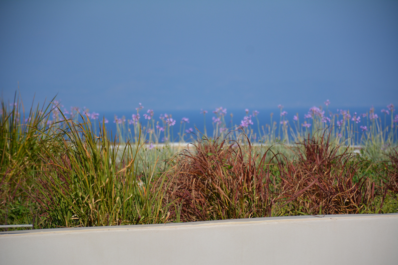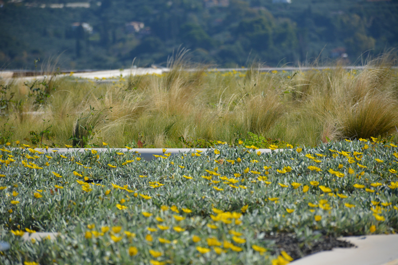 Wesentlich für den Begrünungserfolg ist die an das mediterrane Klima angepasste Pflanzenauswahl. Daher wählte man trockenverträgliche Arten wie zum Beispiel das orientalische Lampenputzergras (lat. Pennisetum orientale) oder das Silberhaargras (lat. Imperata cylindrica) aus der Gattung der Süßgräser. Auch das Zarte Federgras (lat. Stipa tenuissima) macht mit seinen filigranen Halmen den Meereswind sichtbar und erzeugt ein lebendiges Spiel auf dem Gründach. Desweiteren sind die Mittagsgoldblumen (lat. Gazania rigens var. Leucolaena) mit ihren leuchtend gelben Blütenköpfen und grauweißen Blättern zu nennen. Diese niedrig wachsende mehrjährige Krautpflanze gehört zur Familie der Korbblütler. Der weißbunte Südseeknoblauch (lat. Tulbachia violacea) verströmt ein feines Knoblaucharoma.