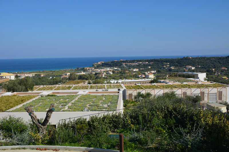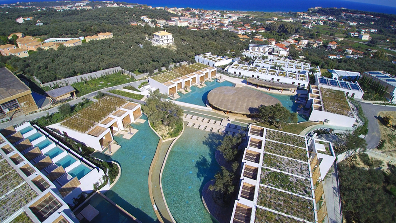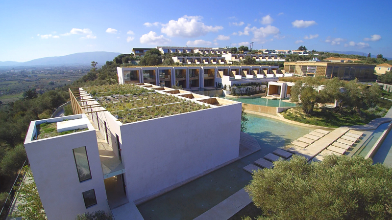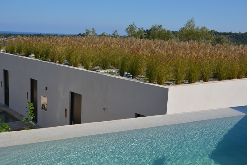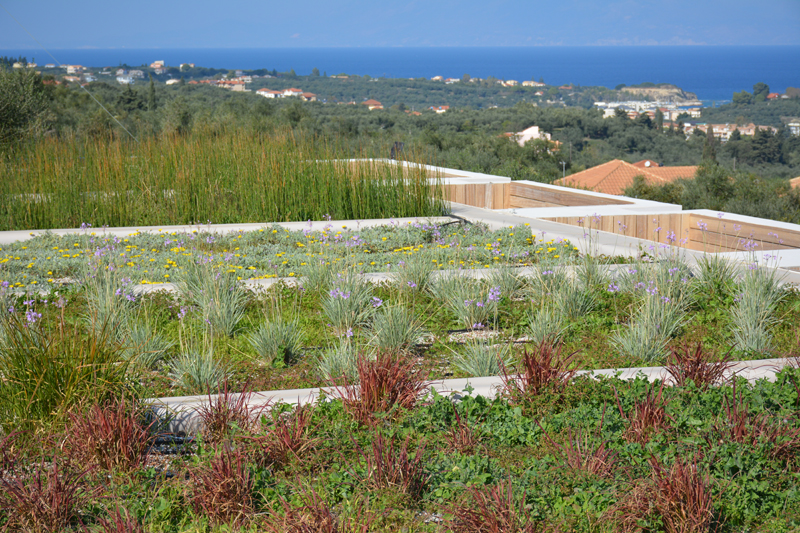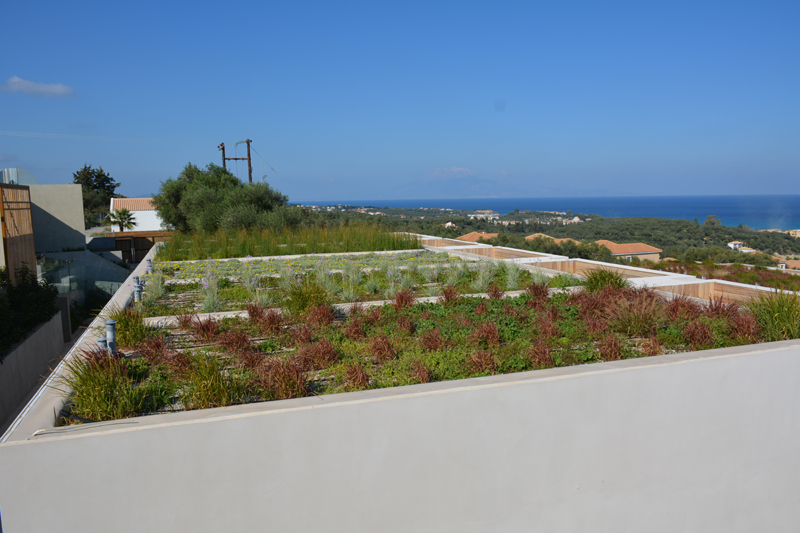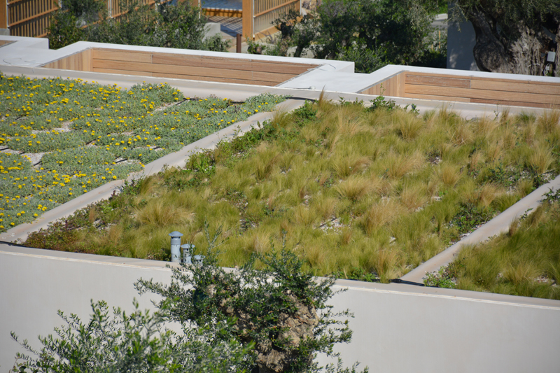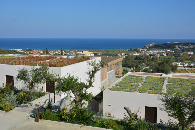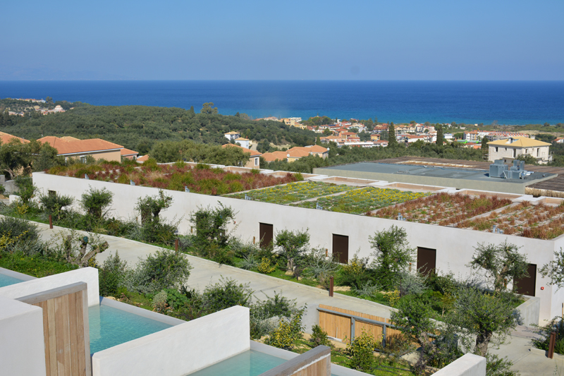 Ein Spaziergang inmitten von Olivenbäumen, Johannisbrotbäumen und glitzernden Wasserflächen bietet immer auch einen Blick auf die Gründächer der weiß getünchten Wohngebäude. Die Gründächer sind nicht nur optisches Highlight als Mustergeber und dienen dazu, die Hotelanlage in die grüne Umgebung einzubinden. Sie haben weitere glasklare Vorteile wie zum Beispiel: Schutz der Dachabdichtung durch den Ausgleich von Temperaturunterschieden, verbesserter Schallschutz und vor allem Kühleffekt im Sommer, weil die Begrünung wie eine zusätzliche Dämmung wirkt. So lässt sich auch die griechische Sonne stets genießen.