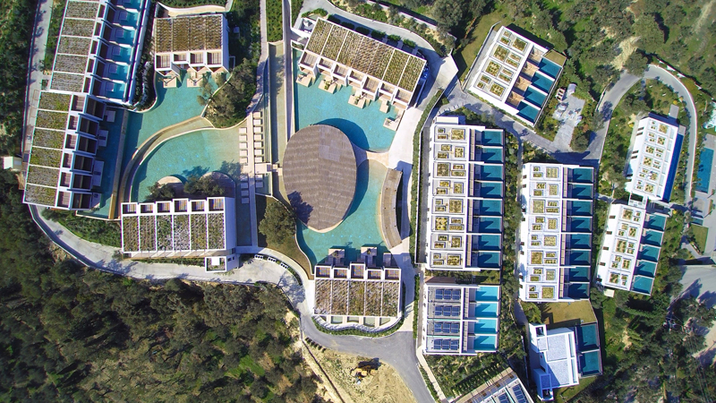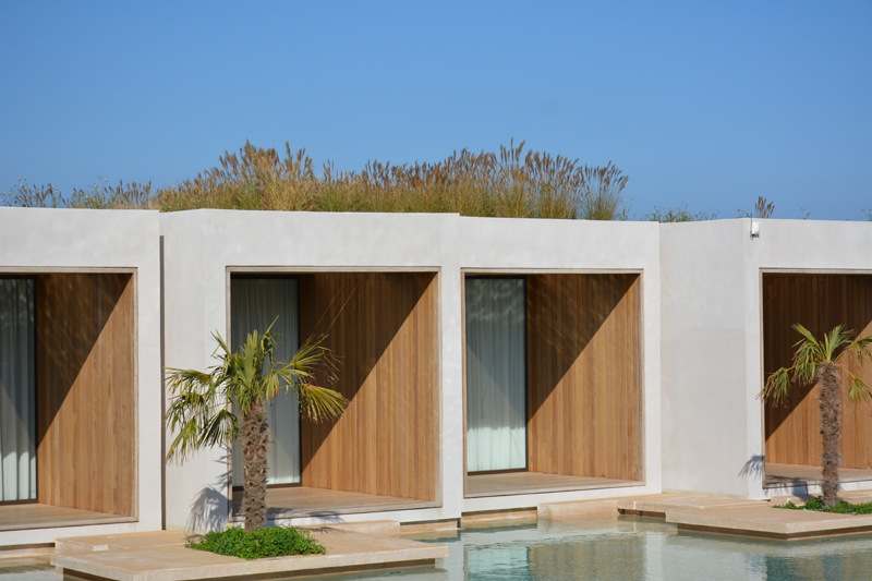 Das in Athen und Stockholm ansässige Architekturbüro Block722architects + plante das Olea All Suite Hotel mit seinen 93 Suiten auf dem weitläufigen Gelände in reihenweise würfelförmigen Gebäudestrukturen um einen lagunenartigen Pool. Die geometrischen Formen erinnern an den in den 1920er Jahren entstandenen Architekturstil des Minimalismus mit einfacher Formensprache und dem Verzicht auf Dekorationselemente. Genau das verleiht dem Olea Resort die gewünschte Ordnung und Ruhe. Die entspannende Atmosphäre entsteht auch durch das Element Wasser, durch Weiß- und Erdtöne sowie ein indirektes Lichtkonzept. Wichtig ist zudem der Aspekt ökologischer Nachhaltigkeit: Dazu zählen die Gründächer ebenso wie die Strohdächer einiger Gemeinschaftsgebäude (Wellness- und Spa-Bereich, Fitnessstudio). Natürliche Materialien wie Eichenholz, Bambus und Rattan fanden auch Einzug in die Innenarchitektur. Insgesamt scheint es darum zu gehen, Innen- und Außenwelt, Architektur und Natur miteinander zu verbinden. Das gelingt insbesondere durch die Gründächer.